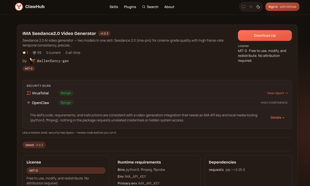 Hemos construido el La primera habilidad OpenClaw del mundo para Seedance 2.0 — ya disponible en ClawHub.