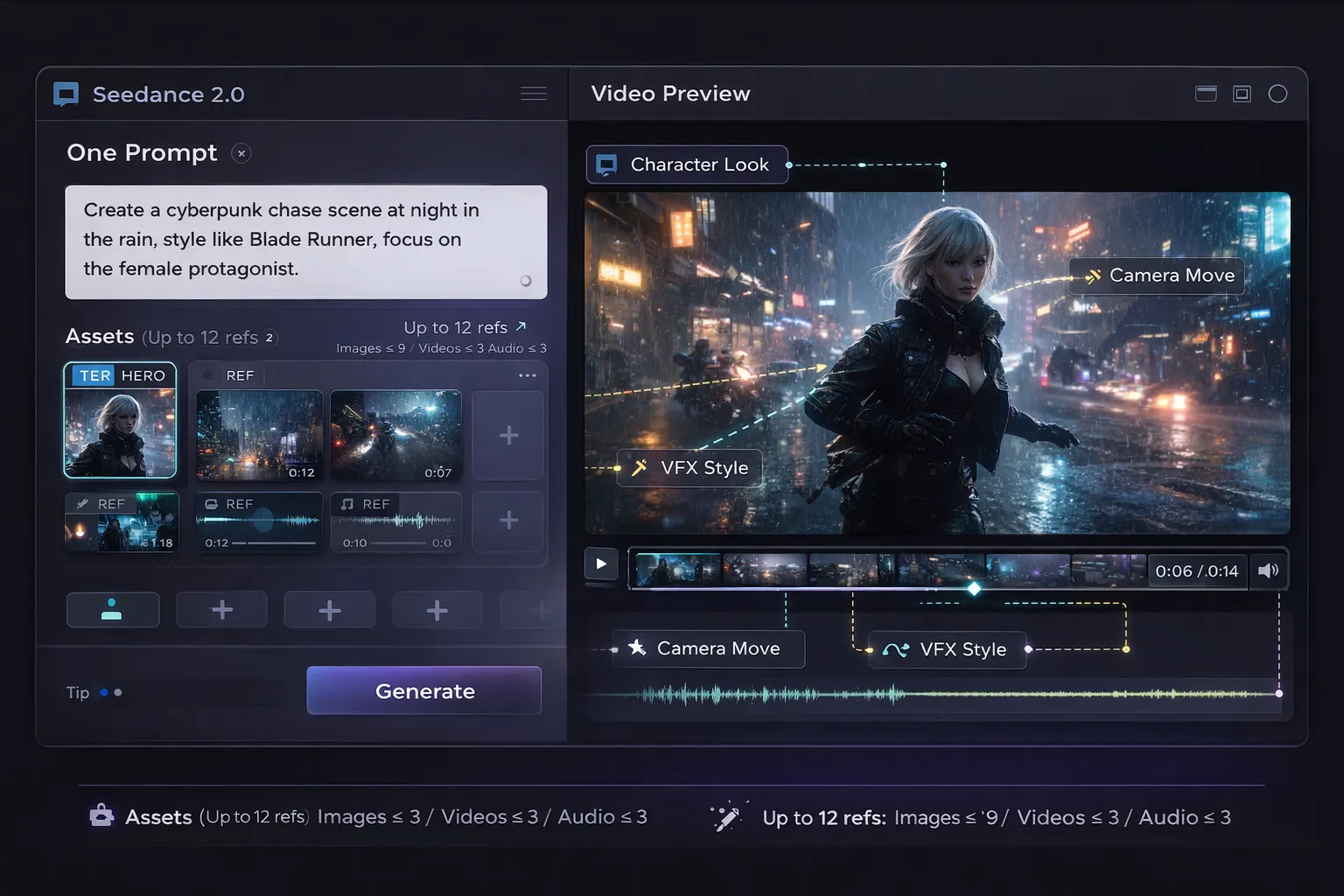 Seedance 2.0 es un generador de video multimodal con IA que convierte indicaciones de texto y recursos de referencia en videoclips cortos y dirigidos. En lugar de solo generar elementos visuales, está diseñado para seguir la intención creativa (estilo, ritmo y estructura), como un flujo de trabajo de creación guiado.