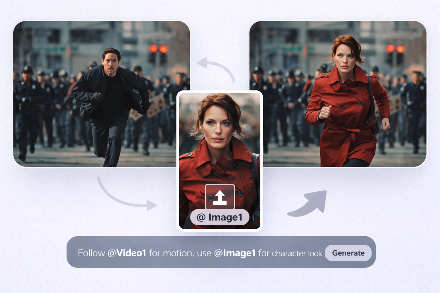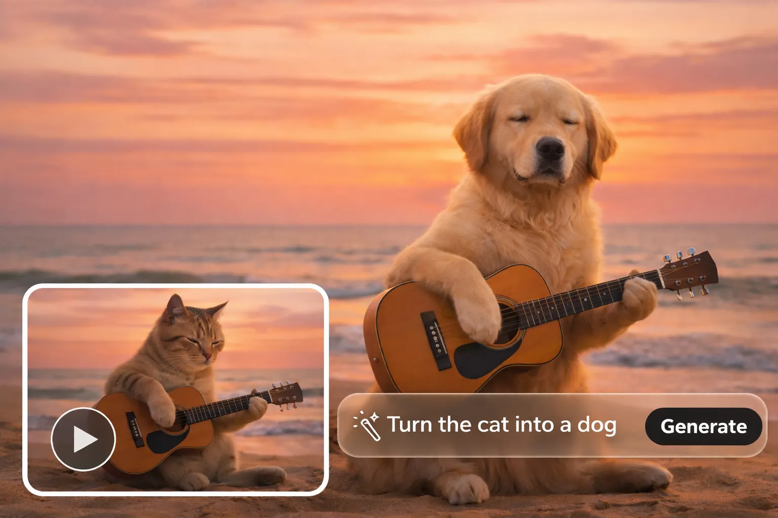 Añade texto, imágenes, videoclips o audio. Para mayor control, puedes combinar hasta 12 archivos de referencia (hasta 9 imágenes, 3 videos y 3 audios).