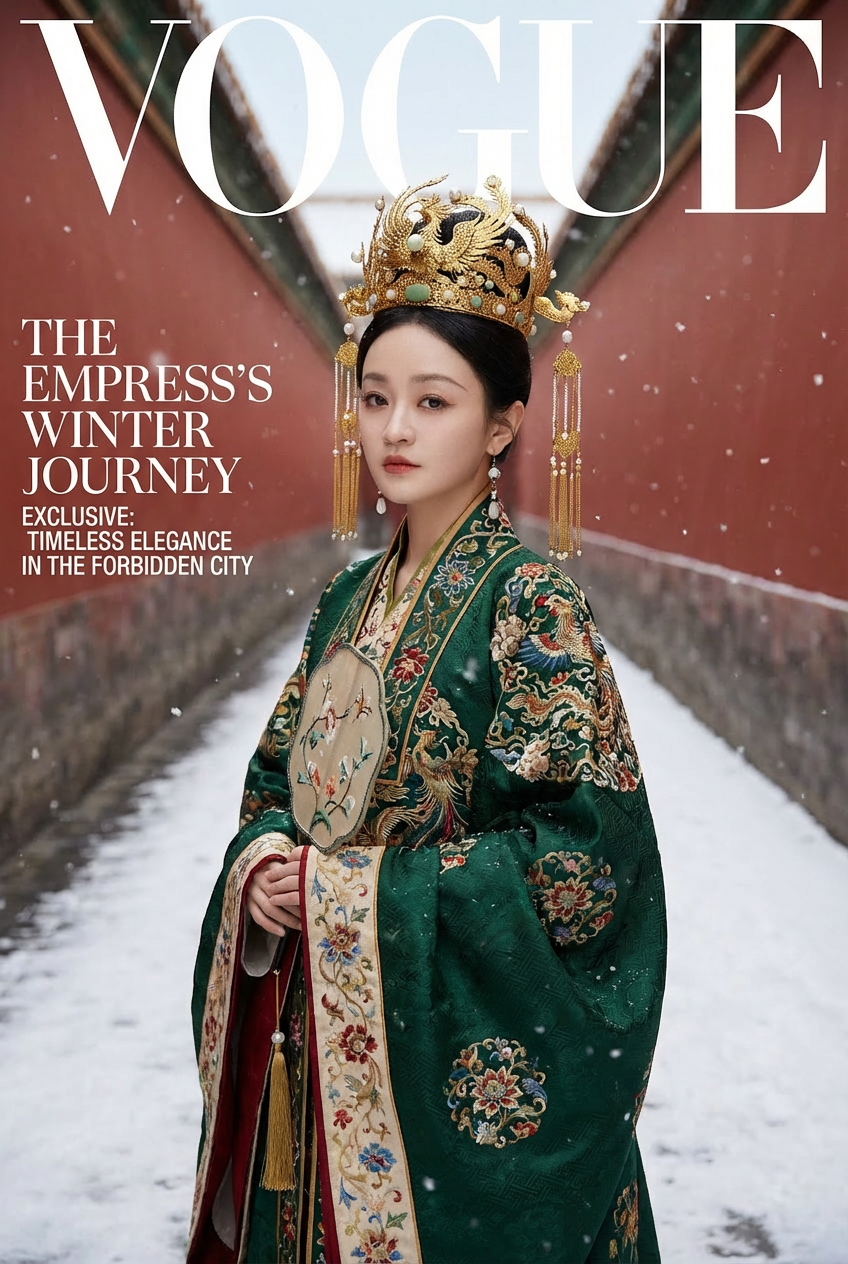 生成一张 9:16 竖版「高端时尚杂志封面级」写实照片:以我上传的 FACE_REF 为人物身份参考,100%还原五官与骨相;人物身穿“明制华丽礼服方向”的重工汉服(多层叠穿、手工刺绣/织金锦、贵重金饰头面),在故宫红墙长廊雪景中拍摄。画面具备《Vogue》《Harper’s Bazaar》《ELLE》《Cosmopolitan》《Marie Claire》《i-D》《Allure》《FLAUNT》级别的摄影、造型与封面设计,以上杂志随机任选一作为杂志的封面设计,并保持选择杂志的一贯设计风格(中英文设计)