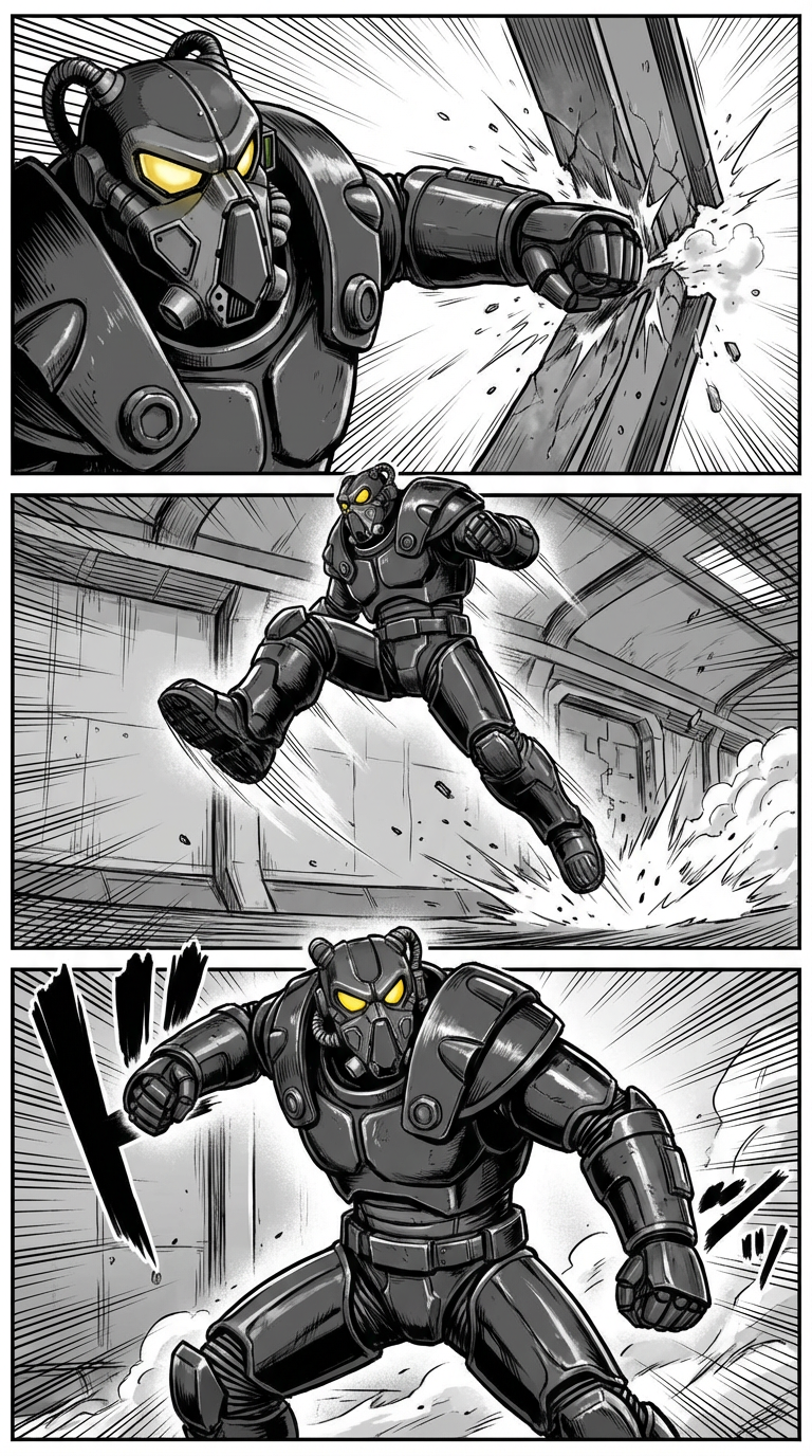 Manga-style comic panels showing Courier from Fallout New Vegas in Enclave power armor, testing the armor's capabilities and ending with full fighting stance. Output images only, no text.