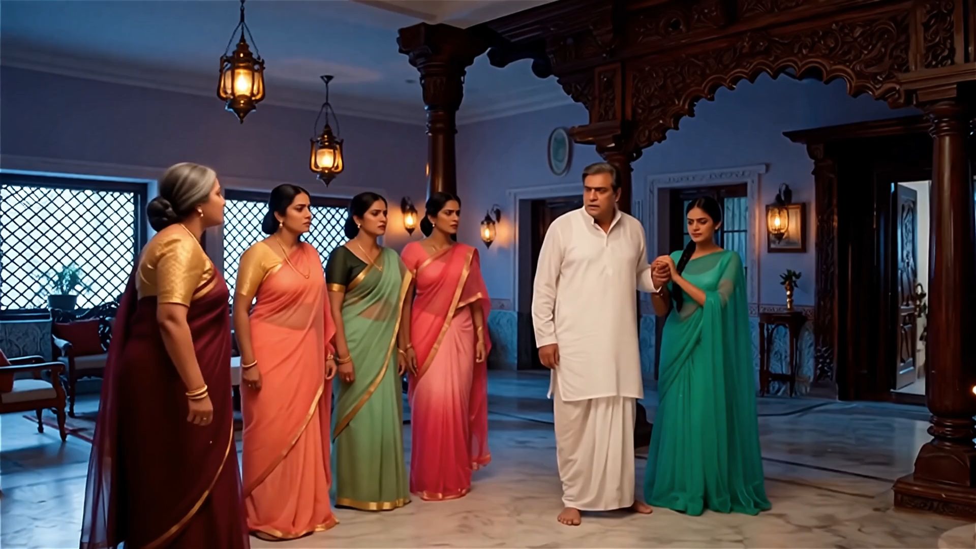 In a scene from an Indian TV show, a man brings home a new wife despite already having several ex-wives living in the house, all of whom are dressed in transparent sarees. The oldest wife confronts him, saying, "How dare you bring her here? How many women do you need?" The new woman speaks arrogantly, "As much as he wants". The other wives chime in, "You will never be one of us. Get out!" The verbal conflict escalates into a fatal physical confrontation among the wives.