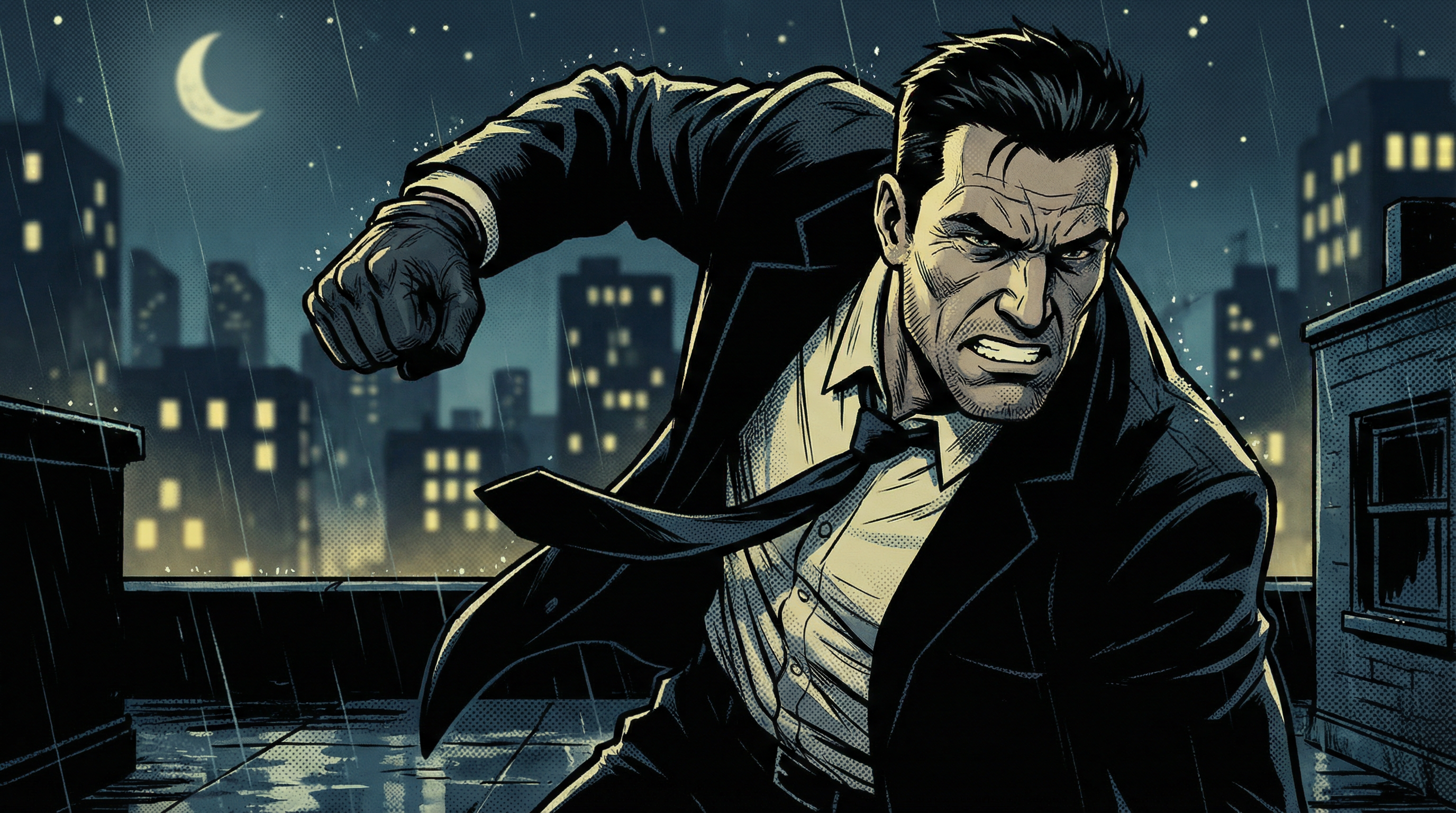 Mid to close-up comic shot of handsome man in black suit lunging forward on a rooftop at night. His hand prepares to strike, expression serious and intense, caught mid-motion with highlighted muscles.