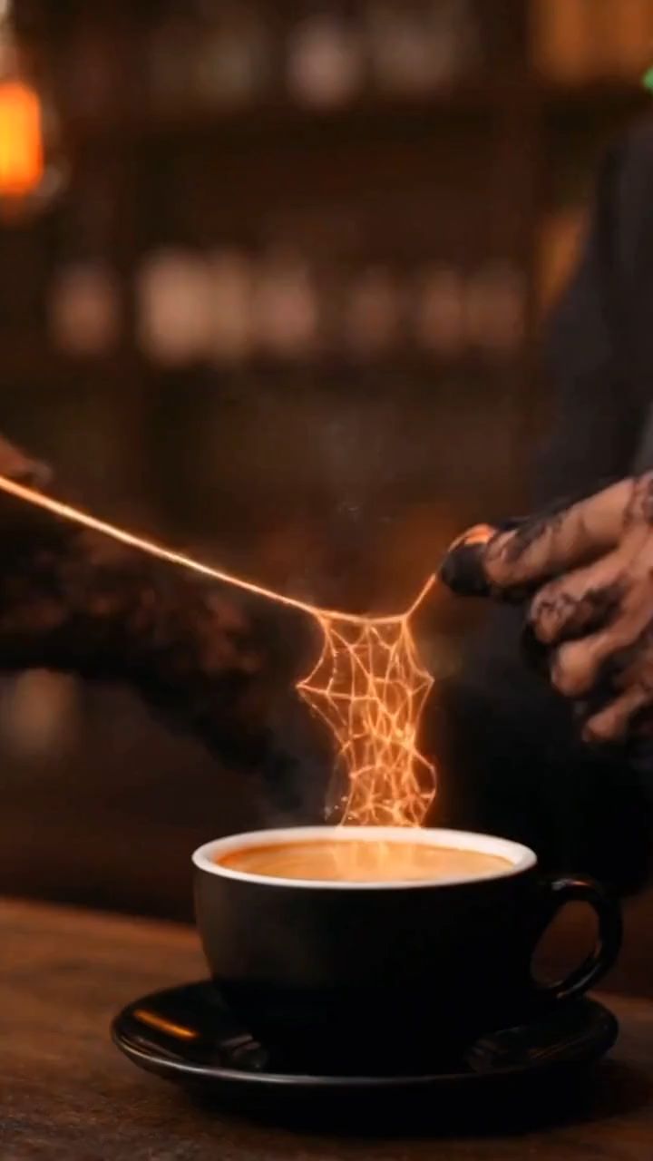 Gothic coffee shop interior, candle-lit with warm orange glow, steam floating in the air. Close-up on a barista's hands — a young woman with dark lipstick, wearing a black apron and lace gloves, pulling glowing silk-like threads between her fingers to create latte art. Camera pans up to reveal her concentrated expression, neon spider-shaped earrings dangling. Switch to over-the-shoulder shot showing a customer — a man in casual jacket watching curiously. Customer (smiling): "That latte art looks amazing…" Camera close-up on cup as silk threads glimmer. Customer (stunned): "Wait… is that spider web?!" Barista (grinning slightly): "Halloween special." End with cinematic close-up of the glowing web pattern in the coffee, soft background jazz, realistic texture, detailed steam, slow focus pull, cozy yet spooky mood, 4K ultra detail.