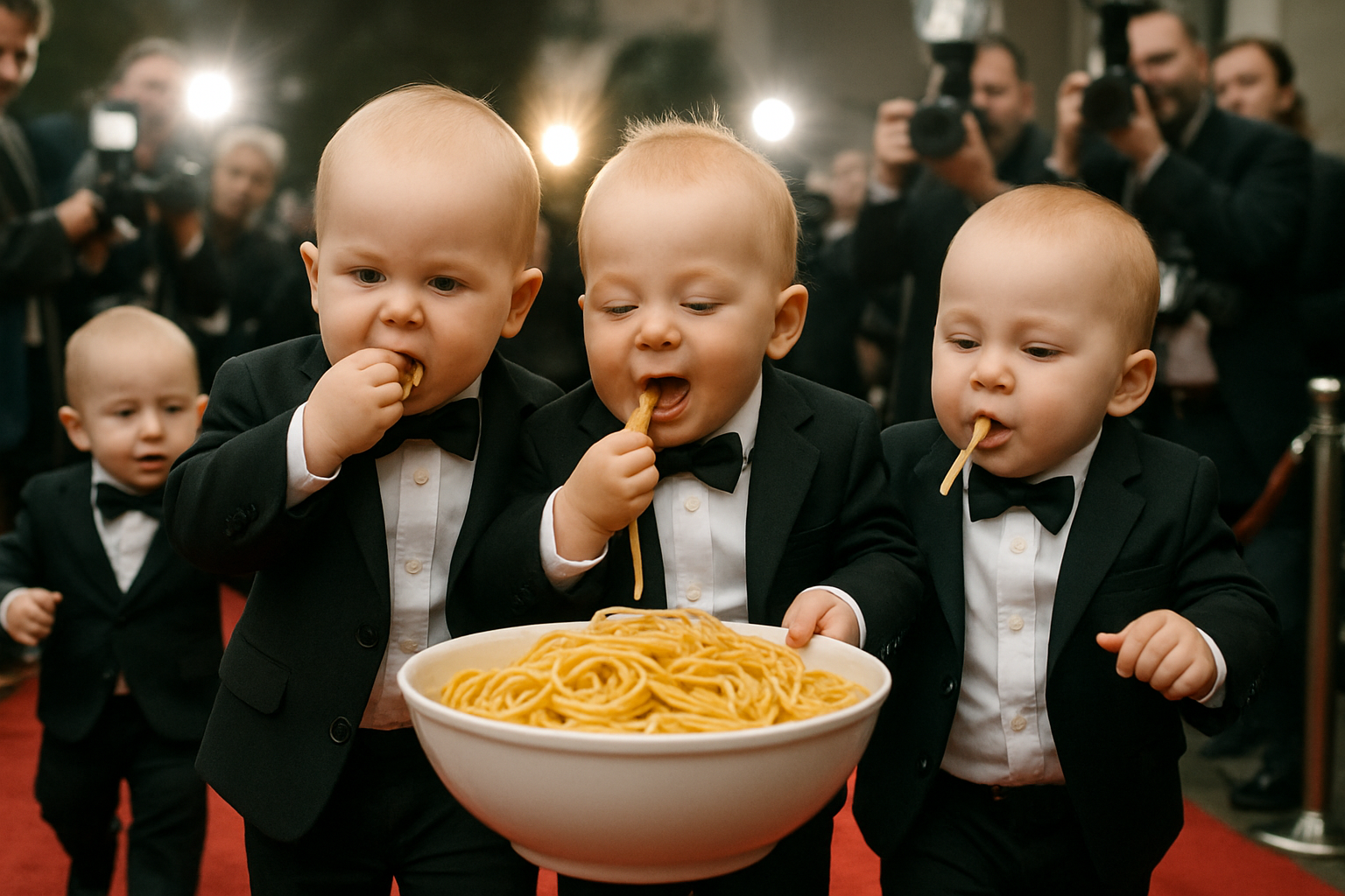 babies wearing formal suits walking on red carpet, giant pasta bowl in front, eating while walking, background with camera flashes and reporters, absurd meme style