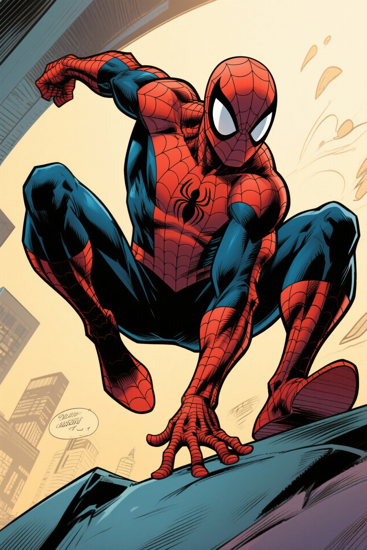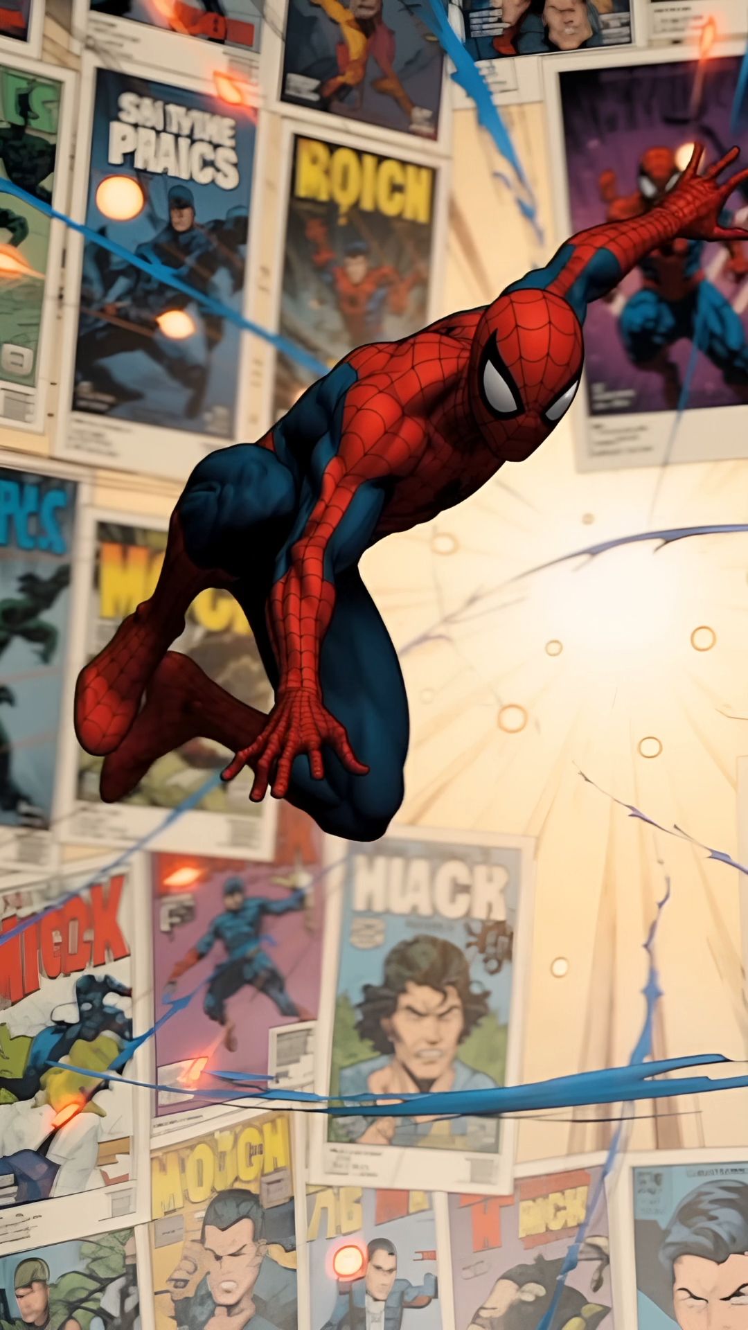 Multiple classic comic posters swirl and rotate around the frame. Spider-Man moves through the spinning posters with mysterious motion. Camera focuses on Spider-Man while the surroundings appear blurred and hazy with motion trails and trajectories. High saturation colors create a dynamic visual effect.
