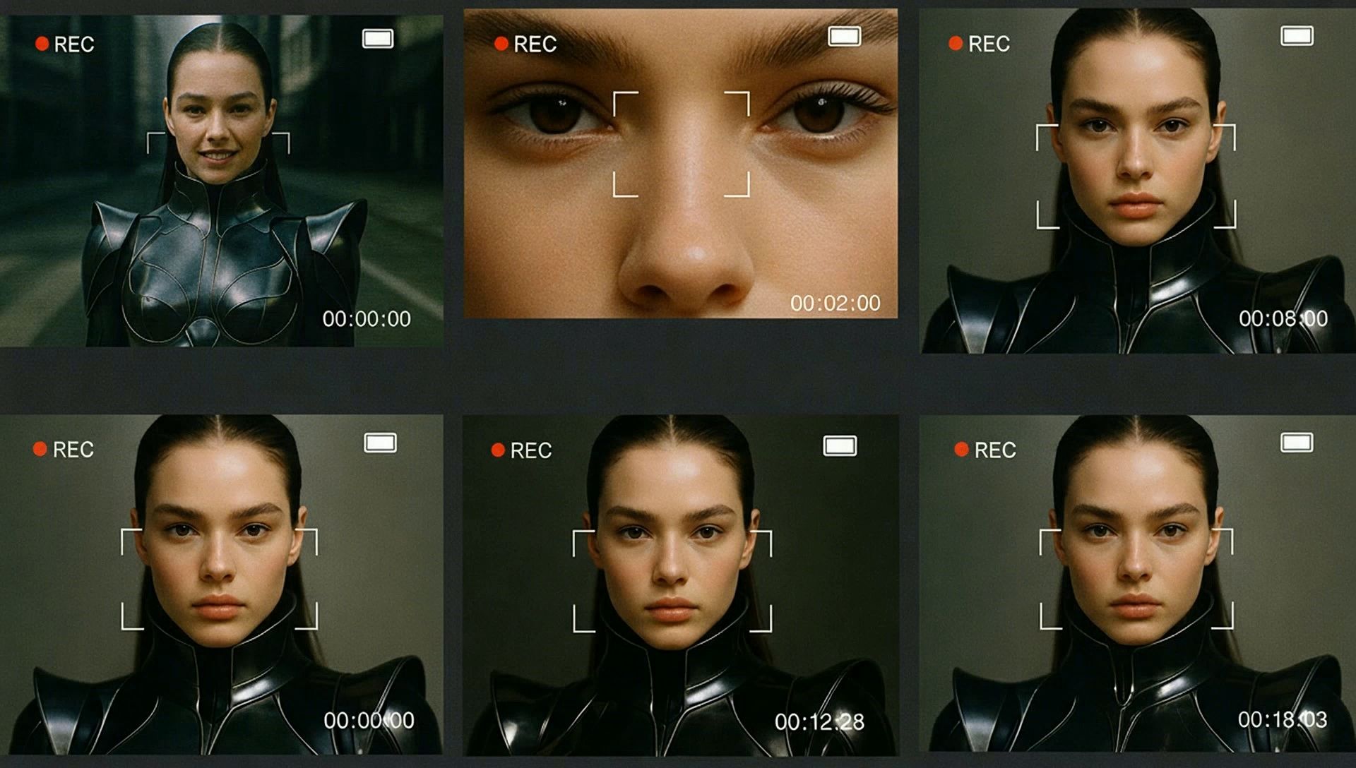 A cinematic sequence showing a young 19 year old female model with glossy realistic skin and youthful beauty wearing avant-garde futuristic high-fashion outfit. The footage appears as if shot through a digital camcorder with on-screen display overlays including battery icon, red REC symbol, and white timer. Set at a busy street corner with natural lighting, the camera captures various expressions and poses of the model, transitioning between close-up shots of her eyes, tight cropped face portraits, and frontal medium shots, all maintaining a retro VHS/digital camcorder aesthetic.