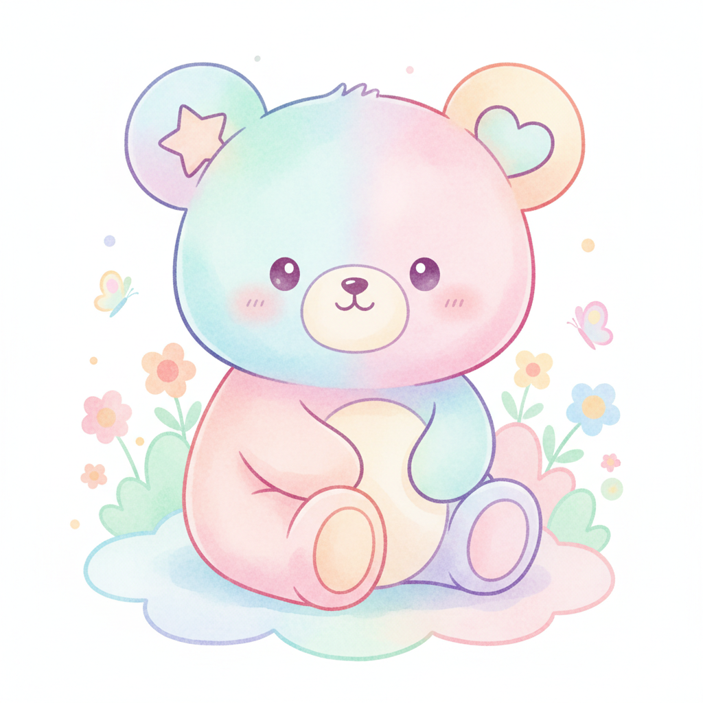 圆润的小熊玩偶卡通,采用无线条的水彩画法,整体色彩为高饱和的马卡龙暖色系,线条柔和、边缘自然晕染,营造出温柔治愈、适合儿童观看的绘本风格卡通形象。要原创 。两边圆润耳朵里边的形状一边是星星形的,一边耳朵里面是爱心形的