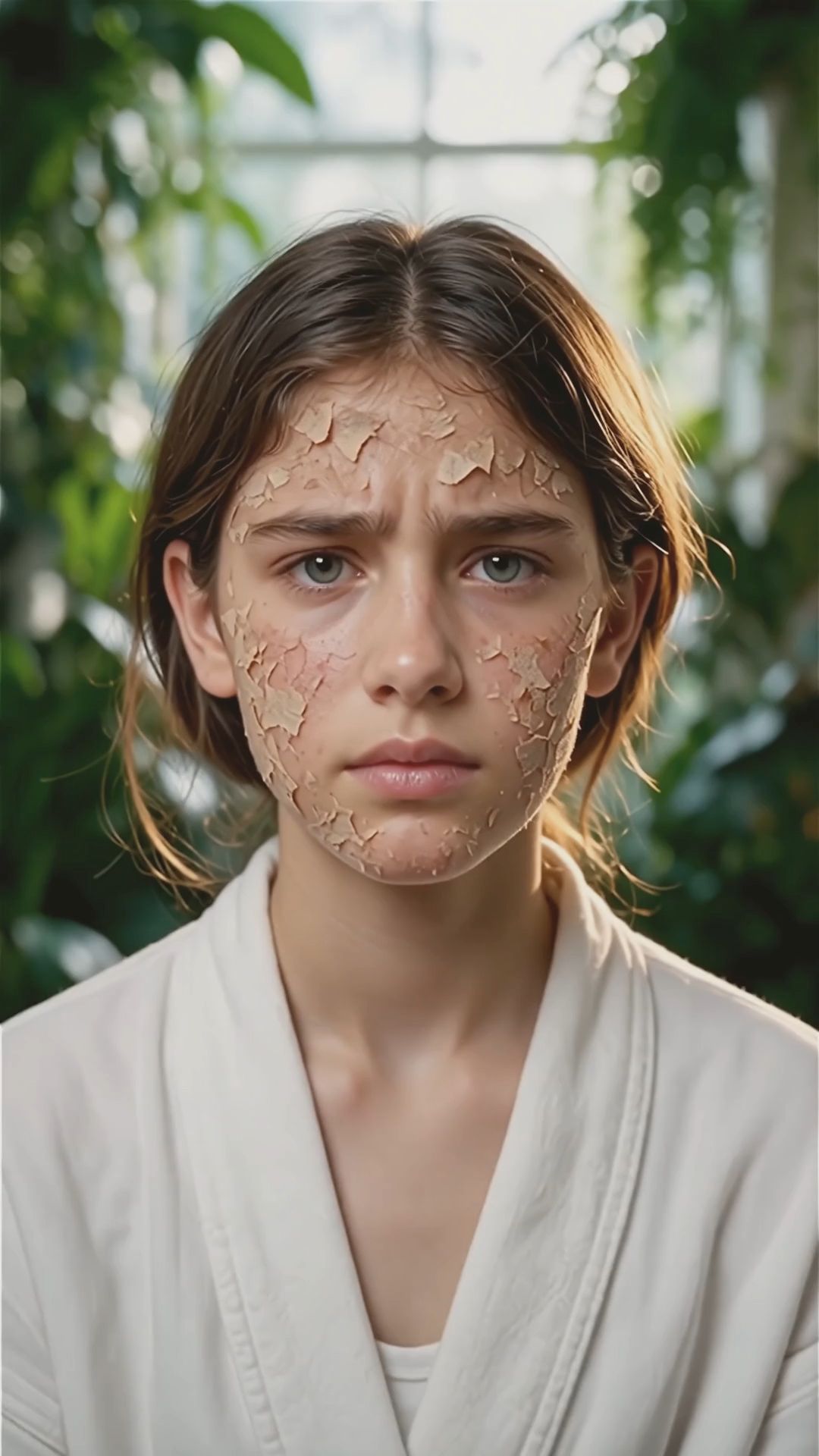 A teenage girl with visibly dry, wrinkled, flaky skin, close-up face shot.