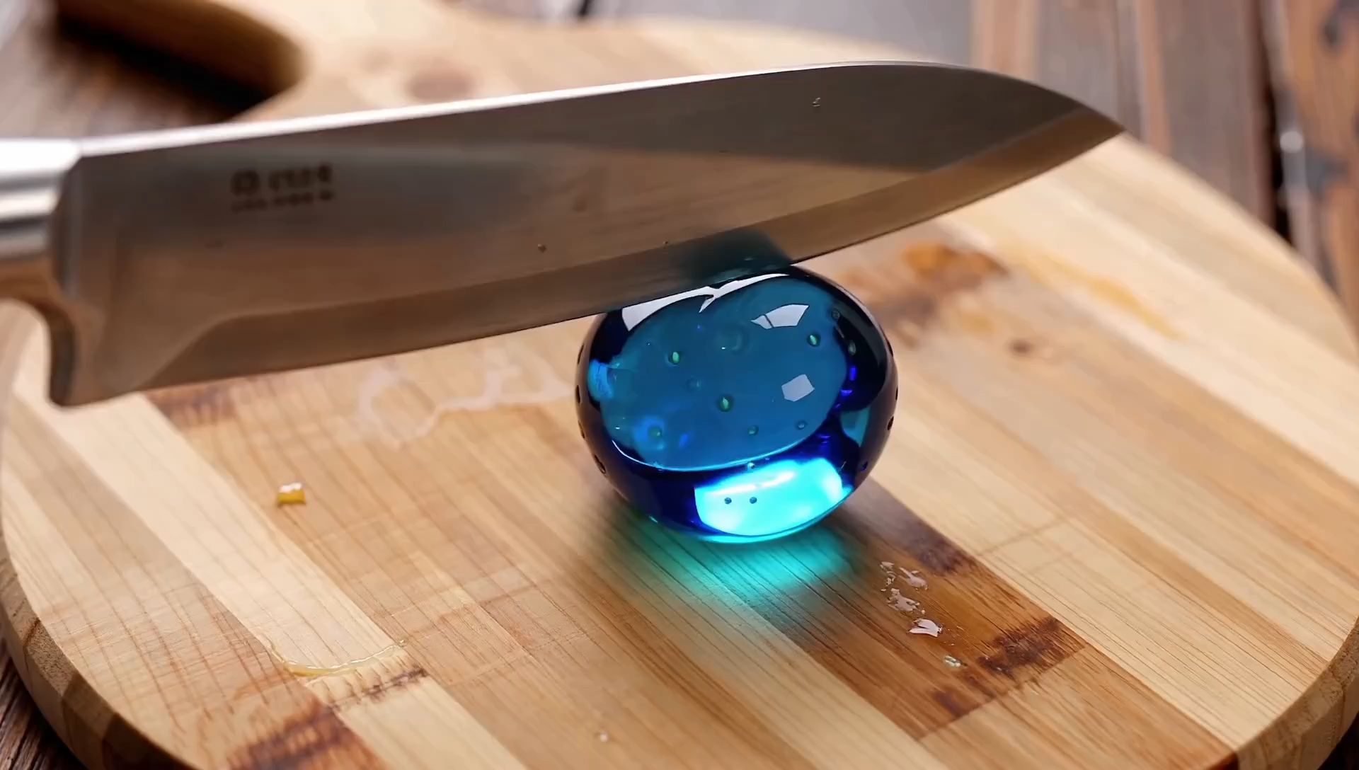 help me realistic 4K footage close-up of a knife rapidly cutting a blue glass strawberry on a wooden cutting board. It slices it multiple times, each slice falls over as the knife moves to the next. The inside of the fruit is also glass. The sound is ASMR style,tools kling, 9:16