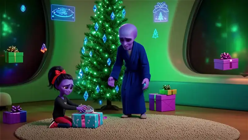 a family of aliens with purple skin. the father says "merry Christmas my dear children" while the little alien girls are opening their presents except for the older girl. the older girl complains to her dad "But what about my birthday today" the mum alien says back to the girl "We don't care, be a role model for once" then the older girl says back with frustration "Ugg's I hate you all"