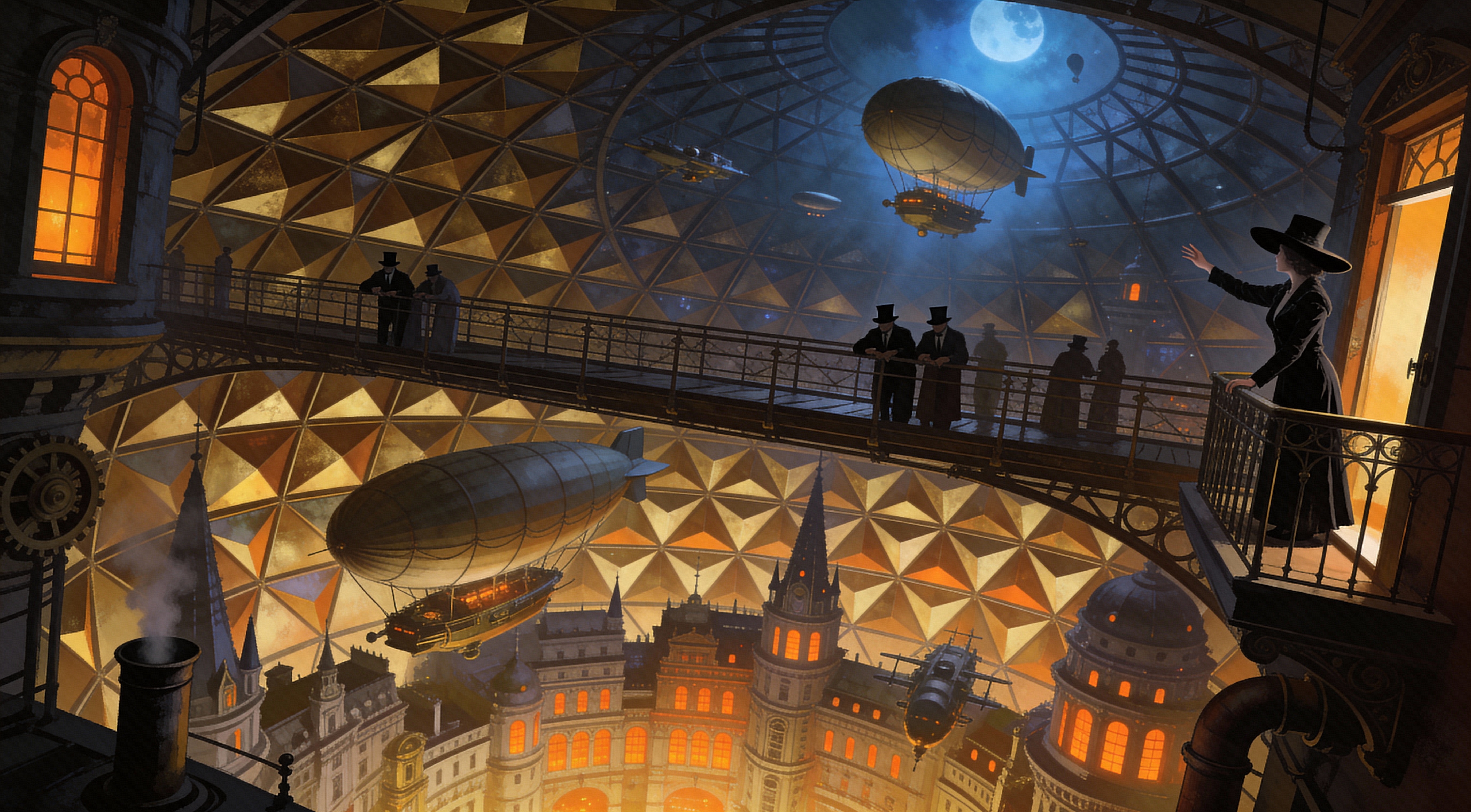 A highly detailed, surreal steampunk digital painting in the style of Syd Mead and H.R. Giger blended with vintage architectural illustration. A vast, impossible spherical city dome made of thousands of golden triangular panels stretches below like a colossal honeycomb, filled with layered levels of intricate Victorian buildings, spires, and glowing orange windows. Massive airships, dirigibles, and flying machines drift silently through the interior space. On a high walkway suspended above the abyss, a group of Victorian-dressed figures in top hats and long coats lean on railings, gazing down at the endless metropolis below. A lone woman in a black dress and wide-brimmed hat stands at an open window on a higher balcony, reaching out toward a passing airship. Dramatic chiaroscuro lighting with deep shadows, warm golden-orange highlights from below, and cool blue moonlight filtering through the dome. Intricate mechanical details on the architecture, steam vents, gears, and pipes. Moody, atmospheric, sense of vertigo and wonder. Sharp focus on textures of metal, glass, fabric, and light refraction. Cinematic vertical composition, ultra-high resolution, dreamlike retro-futuristic masterpiece. Aspect ratio 16:9.