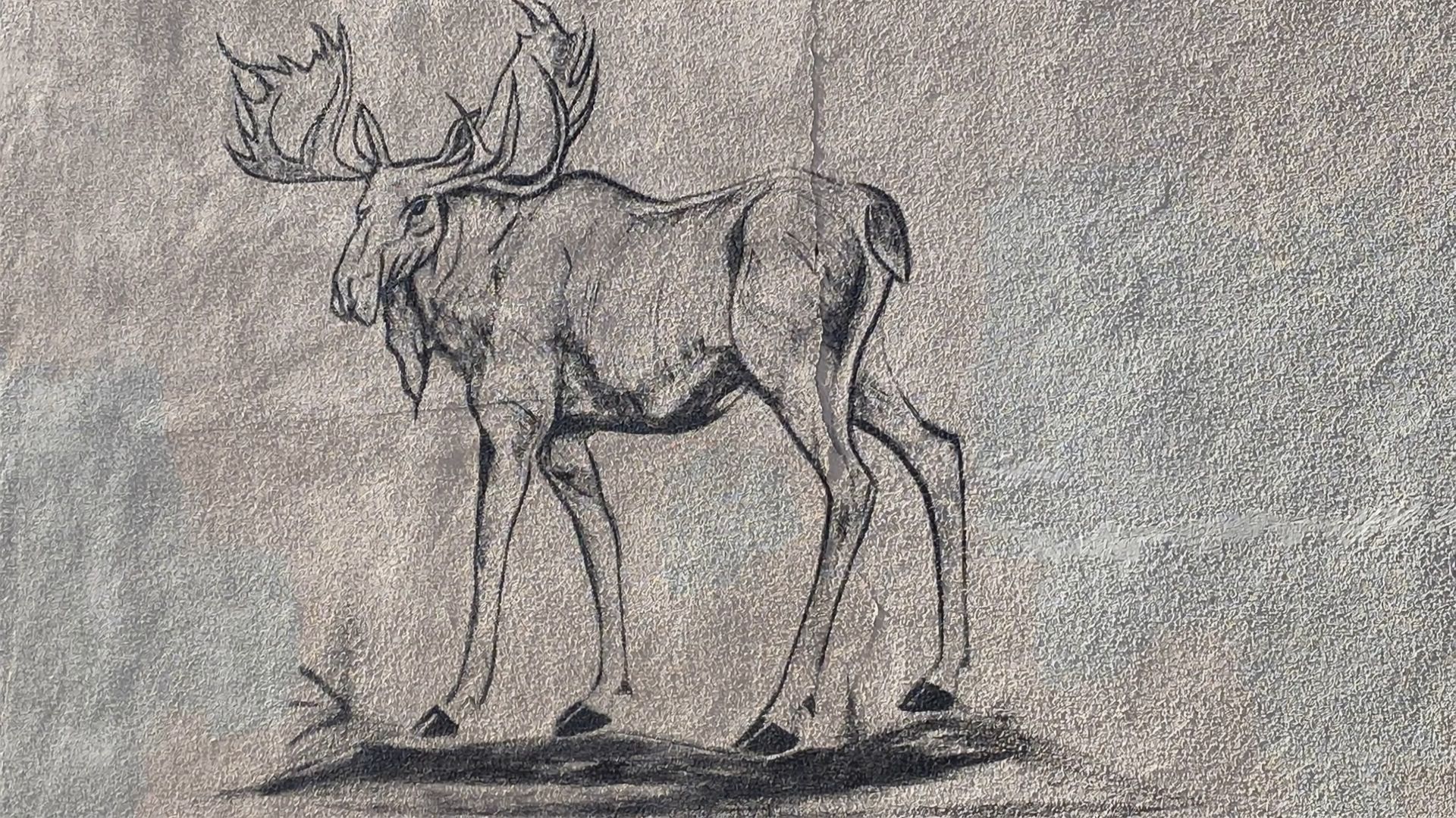 The graffiti moose snorts in anger, turns toward camera, and then runs right by camera in a fury. Illustrated on concrete wall