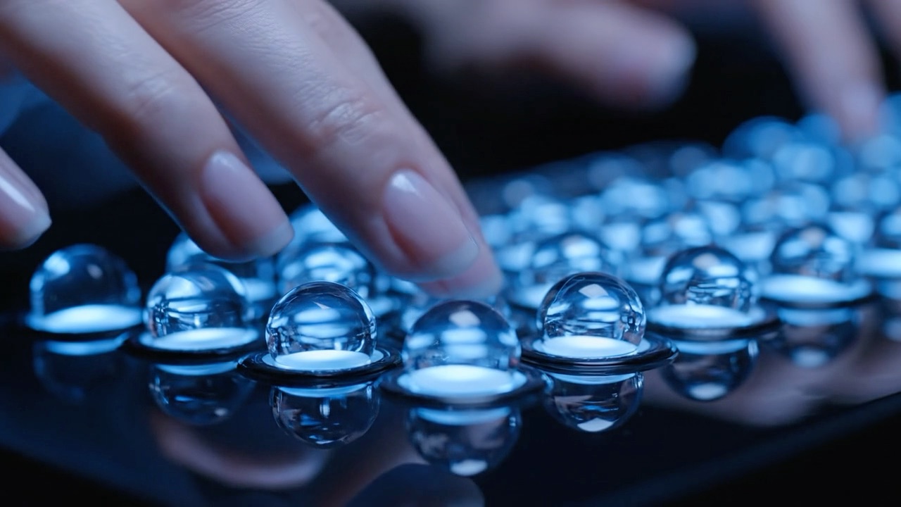 Ultra-realistic 4K macro shot of elegant hands slowly pressing futuristic keyboard keys made of glowing liquid water droplets. Each press creates tiny crystal-like splashes with soft water droplet sounds and ASMR liquid echoes. Dark glossy surface with shimmering reflections and cinematic lighting.