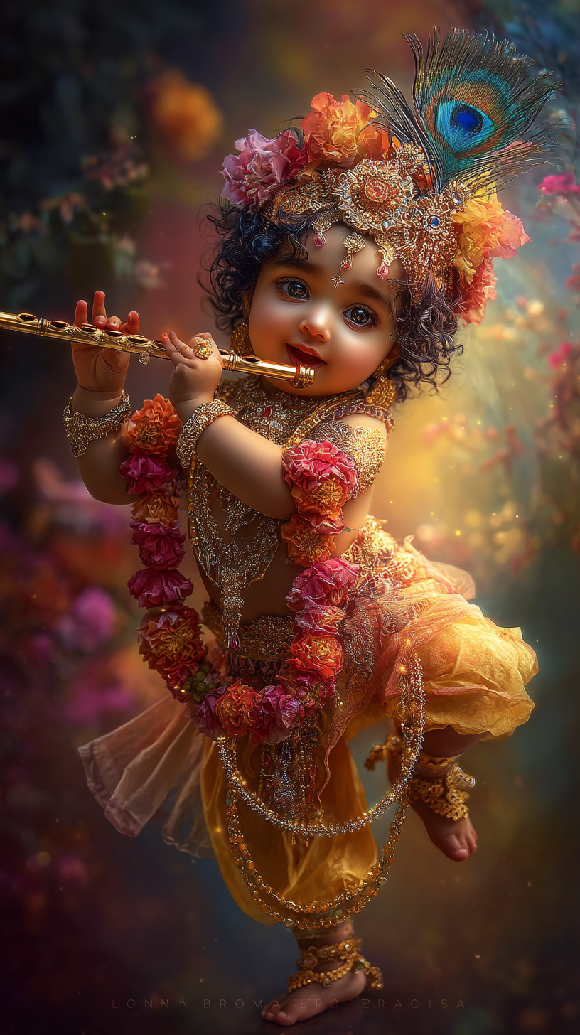 Adorable baby Krishna in graceful tribhanga dancing pose—body forming elegant triple-bend curve, chubby leg bent crossing other, tiny foot lifted delicately, one arm raised holding golden flute, other arm at waist, head tilted divinely. Ultra-cute chubby toddler with doll-like features, luminous fair milky-white skin glowing with divine ethereal radiance, soft peachy-pink undertones, rosy pink cheeks, large expressive bright hazel-brown eyes sparkling with celestial light and innocence, long black eyelashes, sweet enchanting smile with coral-pink glossy lips. Ornate antique golden crown with intricate filigree patterns, pearl clusters, ruby gemstones, magnificent peacock feather with vibrant electric blue-turquoise-green eye pattern. Voluminous curly dark black hair with individual ringlets flowing. Luxurious red-orange silk vest heavily embroidered with golden zari work, mirror work, gemstones. Bright sunshine yellow silk dhoti with golden border flowing gracefully. Heavy ornate golden jewelry—multiple layered necklaces with emeralds, rubies, pearls, thick armlets, bangles, anklets with bells all sparkling divinely. Fresh flower garlands—red roses, orange marigolds with golden glitter. Surrealistic divine background—soft golden divine light radiating from behind creating heavenly aura, swirling pastel clouds in soft pink, lavender, peach, cream creating dreamy celestial atmosphere. Floating lotus flowers glowing softly. Golden divine sparkles and light particles. Peacock feathers drifting gracefully. Soft bokeh lights. Dramatic cinematic lighting with warm golden key light creating highlights on fair skin, soft fill light, strong divine rim lighting creating luminous halo. Shallow depth of field, hyper-realistic 3D render, heavenly divine atmosphere, 8K quality. --v 7 --ar 9:16 --q 2 --sref https://d1q70pf5vjeyhc.cloudfront.net/media/b8ec9b87071c4e53b549f1e3cab9d1e2/images/1771944485914990706_9NWTSPXV.png