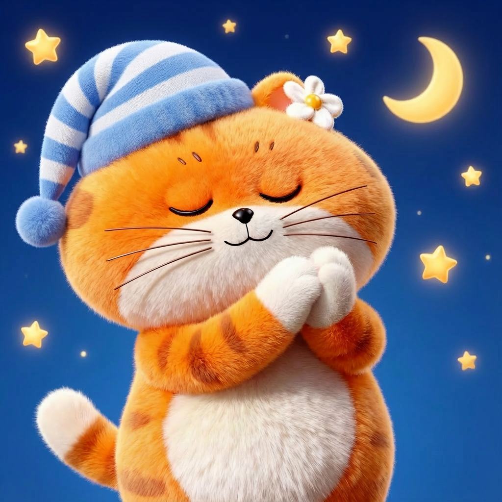 给猫咪加上睡帽,背景增加星星和月牙,其他保持不变