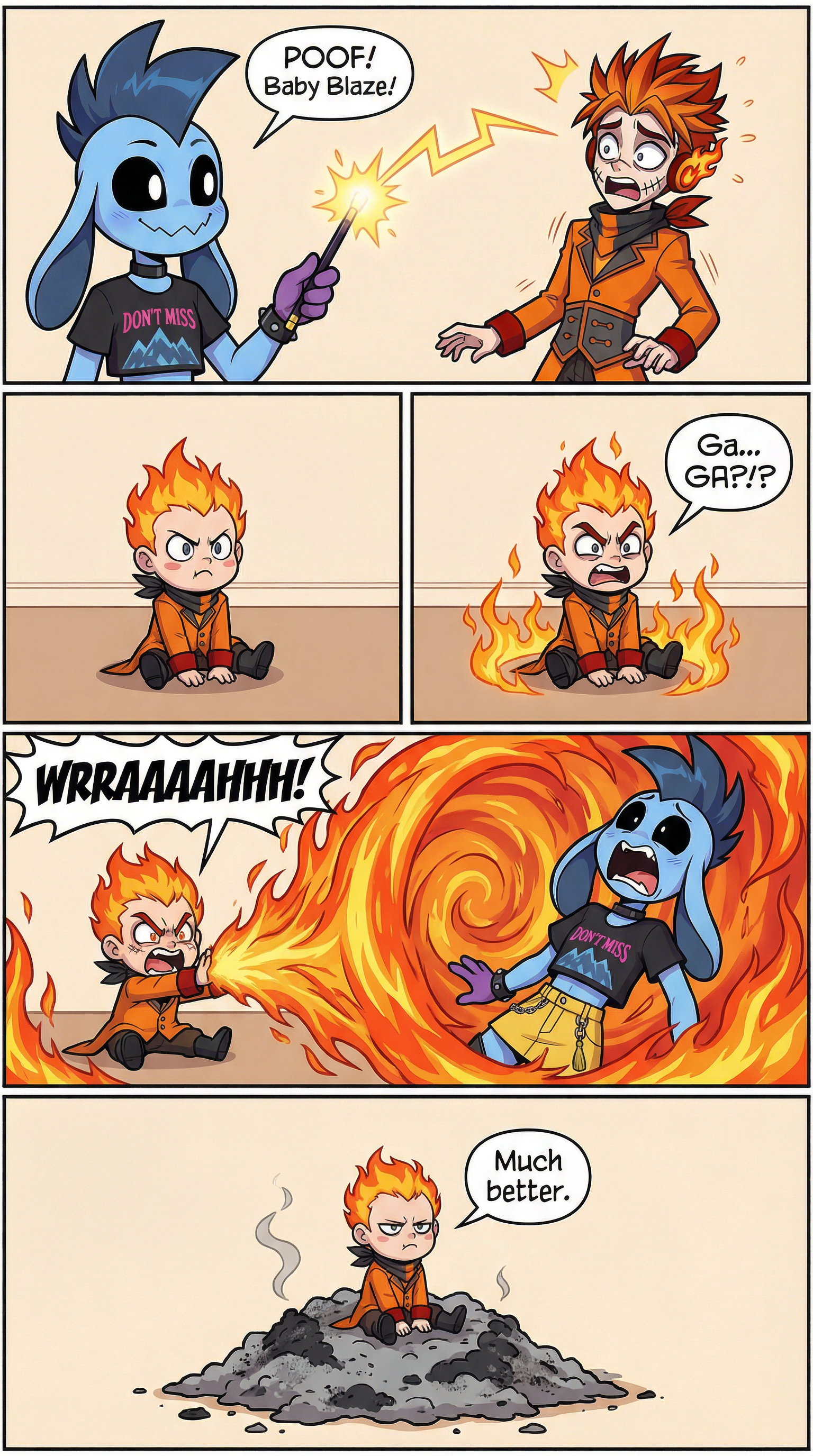 (Comic) Bringo turns Blaze into a baby... Blaze responds by turning Bringo into ash (4 panels) (Bringo has black sclera and white pupils)