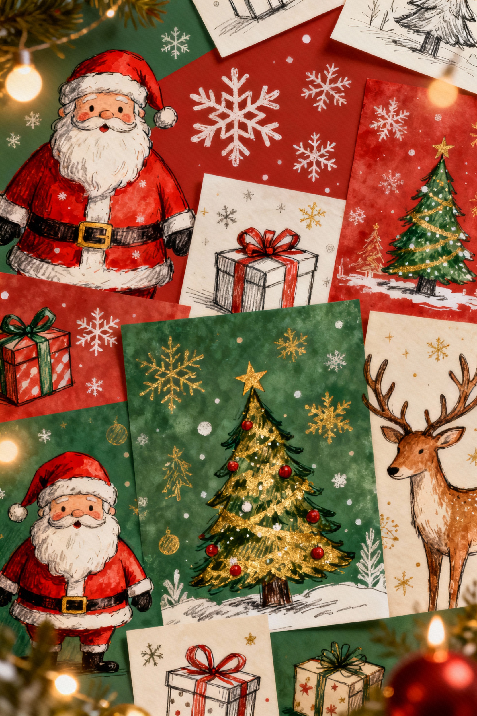Christmas drawing collage wallpaper with festive holiday illustrations arranged in a decorative composition, featuring various Christmas-themed drawings and sketches in a vertical format