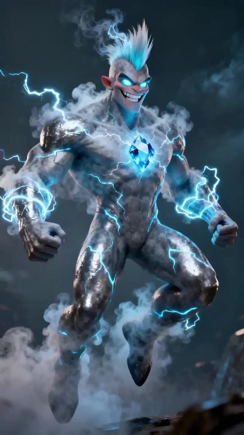 Stylized 3D cinematic animation of The Storm Dancer, humanoid lightning elemental made of vapor and energy. aspect ratio 9:16 vertical video. Camera rotates slowly as electric arcs dance across body, hair made of clouds flows dynamically. Lightning pulses through chest crystal as eyes flash bright blue. Stylized realism like Crash Bandicoot, semi-cartoonish but detailed, dynamic rim lighting with storm effects, mist and rain particles, Unreal Engine aesthetic, cool color grading, 8K, cinematic vibe.