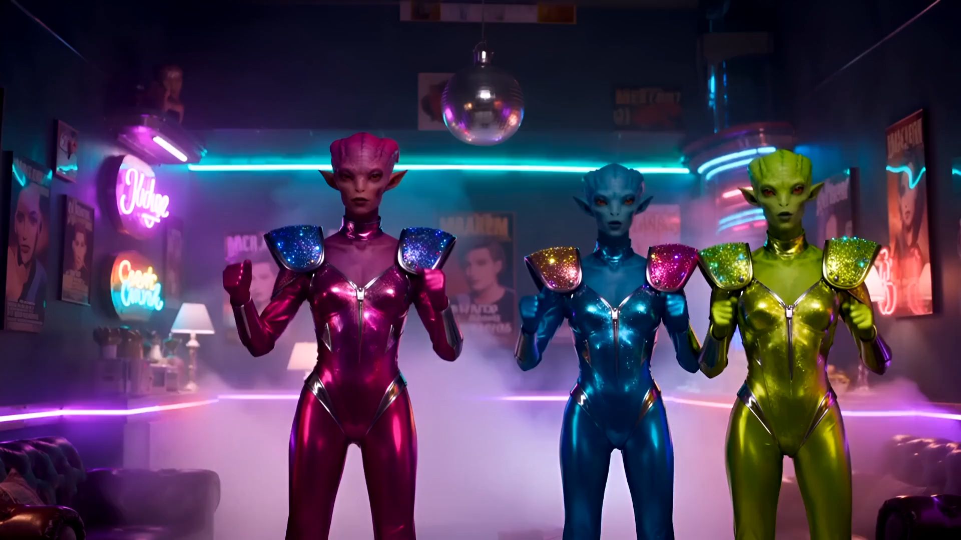 "hair_clothing_motion": "alien costumes shimmer and move dynamically; wigs shift slightly as the lights cut out"
