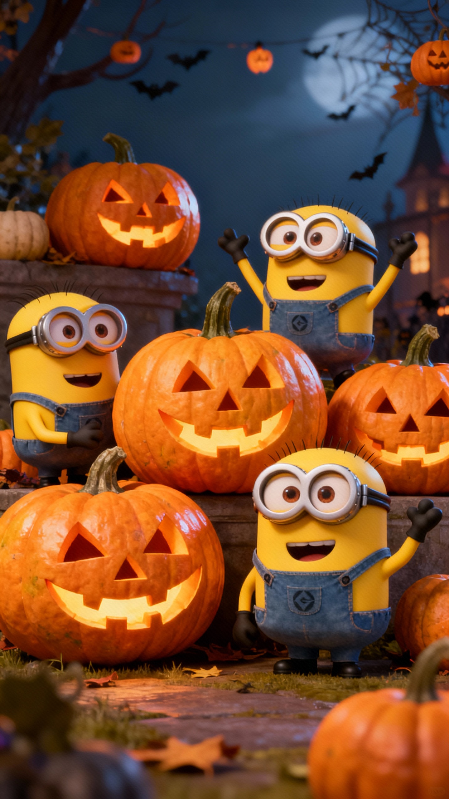 Halloween pumpkins and Minions in 3D style with bright colors. Output images only, no text.