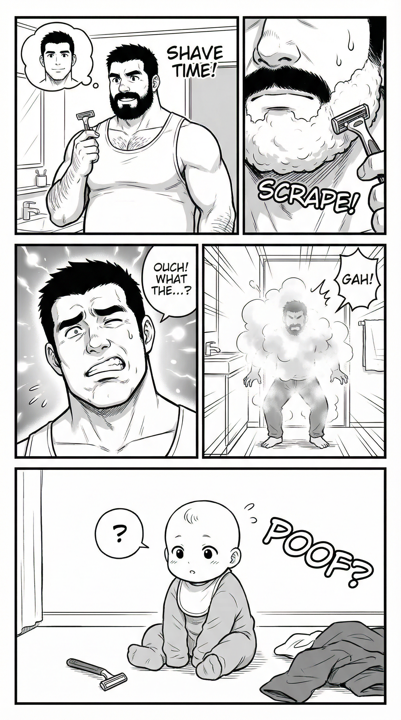 (Anime Style) (Comic) A burly man is painfully transformed into a hairless baby after he shaved his beard off (5 panels)