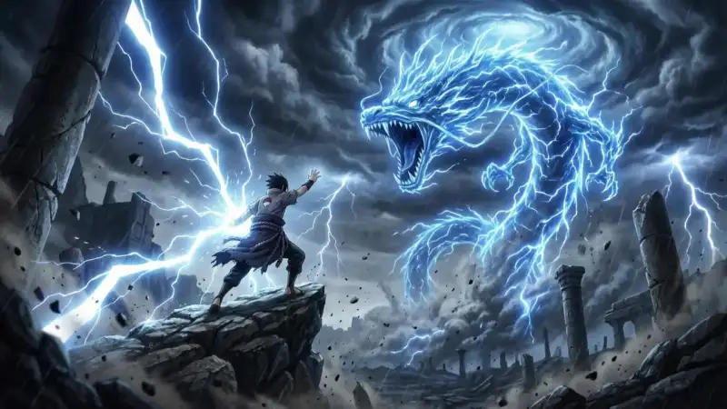 “Ultra-cinematic anime video, MAPPA-style high-intensity action. Dark storm sky swirling violently, thunderclouds rotating above a ruined battlefield. Character with black hair and dark outfit stands on a shattered cliff, summoning a colossal lightning beast descending from the heavens. Lightning veins erupt across the clouds, hyper-detailed electric textures, bright blue-white glow, dynamic particle FX. Camera rotates around the character, fast kinetic movements, wind blasting debris everywhere