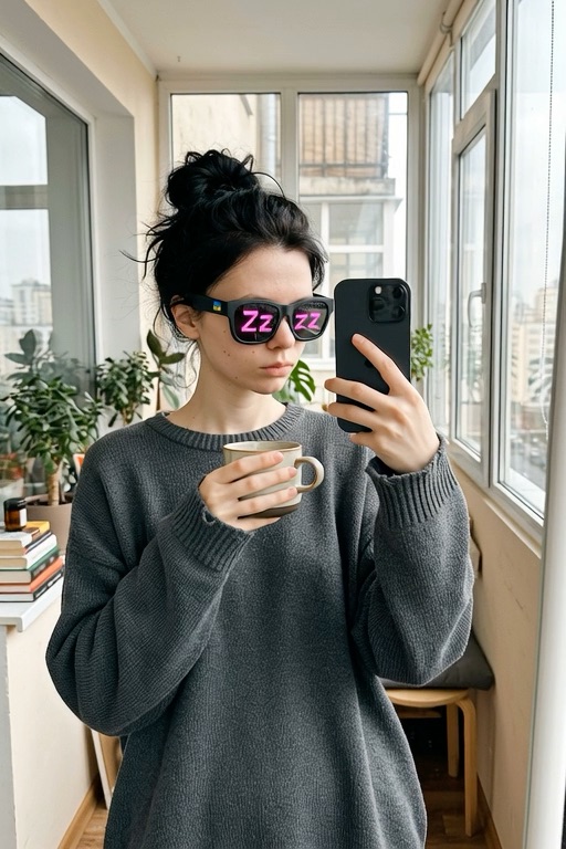 - [2s-5s]: She slowly lifts the mug to take a sip. As she drinks, the LED text on the glasses glitches and scrambles, transforming into a "LOADING..." bar animation. Her face remains stone-cold still.