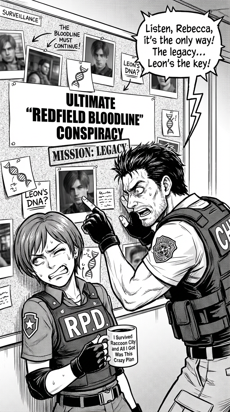 Manga in english, Ultimate "Redfield Bloodline" conspiracy meme. Chris Redfield is pinning a horrified Rebecca Chambers against a bulletin board covered in surveillance photos of Leon S. Kennedy, DNA helixes, and the words "MISSION: LEGACY." Chris is whispering intensely into her ear, gesturing wildly at Leon's photo. Rebecca is frozen in a cringe, one eye twitching, holding a coffee mug that says "I Survived Raccoon City and All I Got Was This Crazy Plan." Style: exaggerated RE Engine character models, comedic lighting, perfect for captioning.