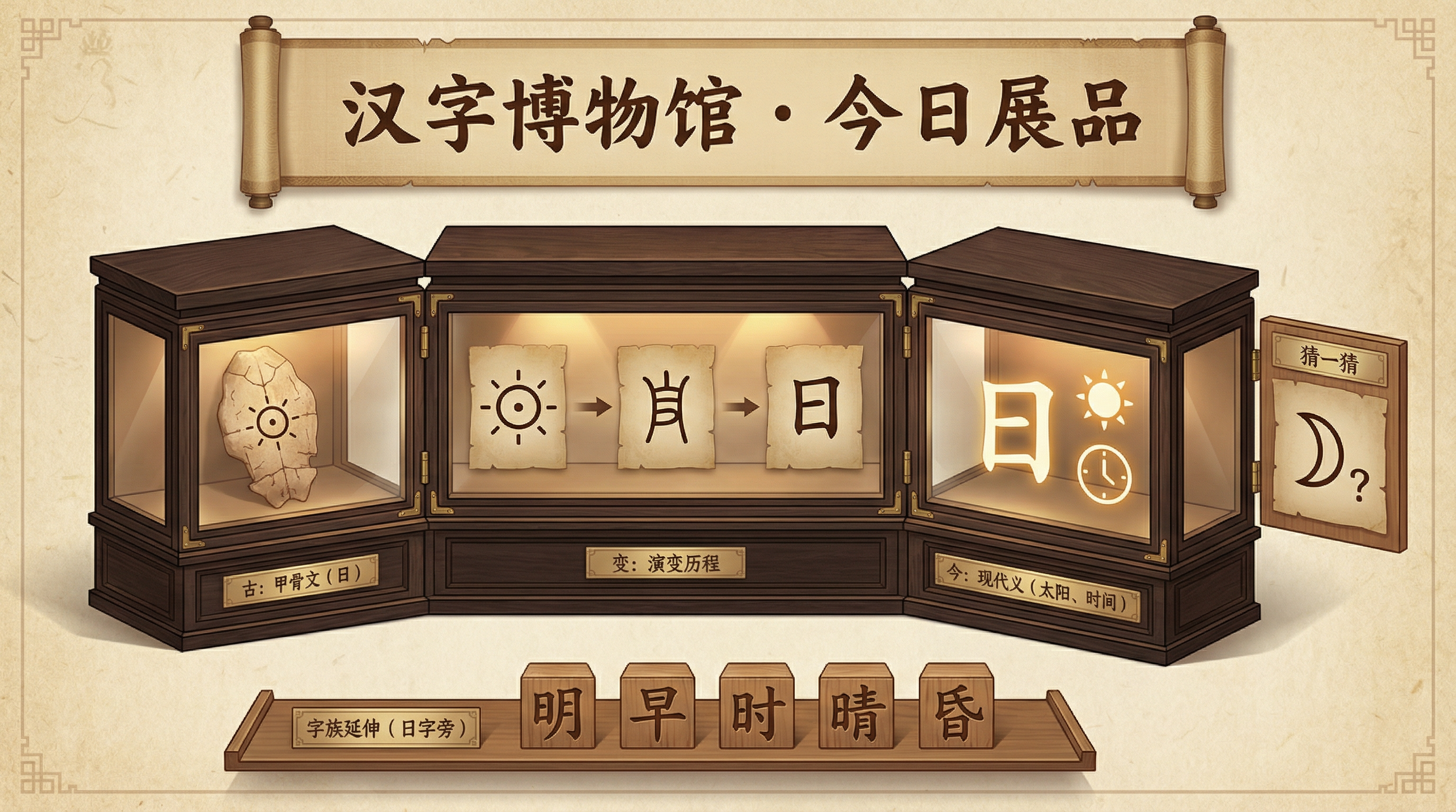 - 展柜1 (古): 展示甲骨文/象形字 (如: 日的象形)