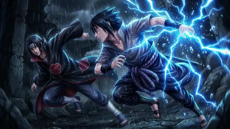 Cinematic anime video, lateral high-speed tracking shot, 10 seconds duration. Scene: Sasuke Uchiha lunging forward with intense ferocity, right hand wreathed in blinding electric blue Chidori lightning, opposing Itachi Uchiha who dodges gracefully in a black Akatsuki cloak with red clouds. Environment: Dark ruined stone temple, heavy torrential rain, wet surfaces reflecting blue arcing light. Art Style: Hyper-detailed anime, Ufotable-style digital compositing for particle effects, MAPPA-style dy