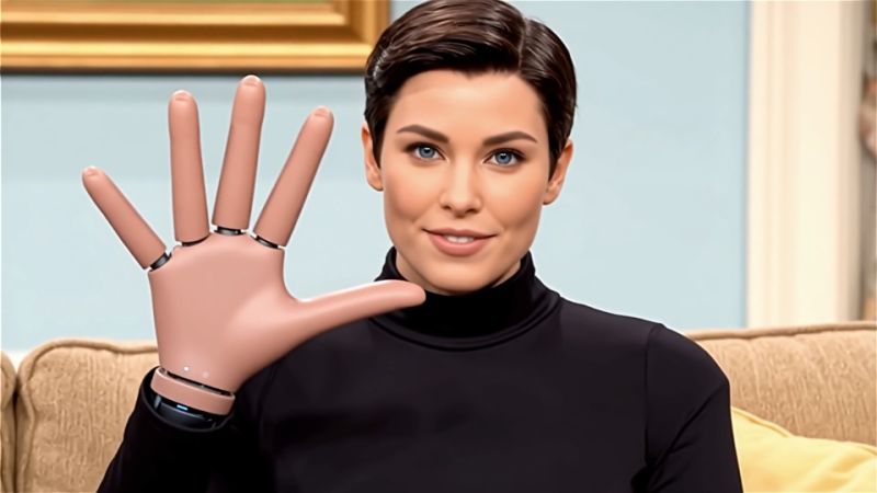 Cut to tight close-up. The AI raises one hand toward the camera, fingers clearly framed. Slight tilt-up to center the hand. The AI says, “See? I even have five fingers now… instead of seven.” Big laugh.