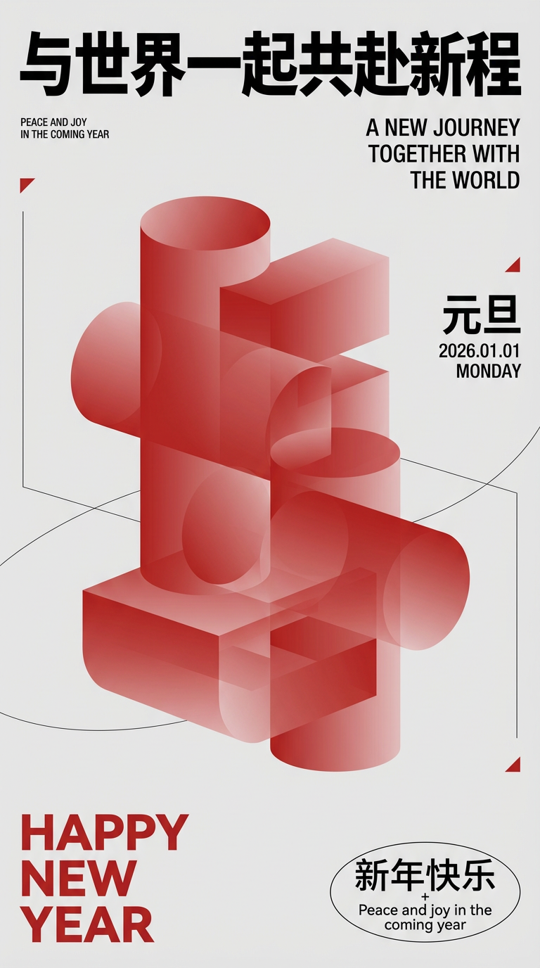 2026元旦主题海报,极简现代设计,日式极简美学结合新中式,低饱和度配色,高清8K,扁平化插画风格,光影柔和,留白充足元旦简约氛围,马年新年主题,商业品牌海报风格,高级感排版,红灰撞色视觉,抽象几何美学,文字层级分明,极简主义的视觉呼吸感。- 视觉核心:红色渐变的抽象几何立体造型(多组圆柱/方块拼接,带通透渐变质感),占据画面中主体区域;