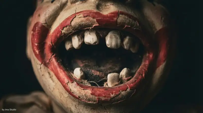 No smiles, no bright carnival colors, no comedy cues.