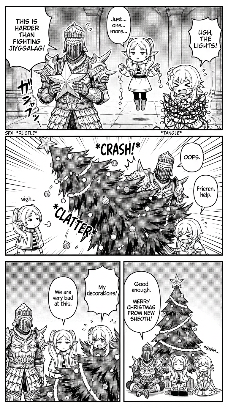 Black and white manga style comic with panels showing Sheo wearing his armor and helmet exactly like the uploaded reference images from first to fifth, tall, closed helmet, no cape, with short Frieren and short Lumine from Genshin Impact, all three trying to make a Christmas tree together, comedy scene with English text and manga panels koma format, set in Castle New Sheoth background similar to the last uploaded image