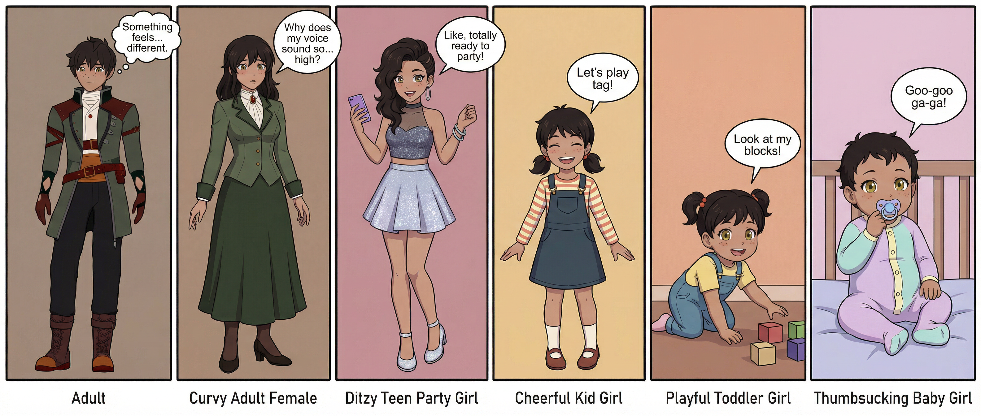 (Official Style) (AR TG) (Age Regression TG Sequence) Oscar regressing into a baby girl (Adult > Curvy Female Adult > Ditzy Teen Party Girl > Cheerful Kid Girl > Playful Toddler Girl > Thumbsucking Baby Girl) (Dialogue Implying Mental Changes)