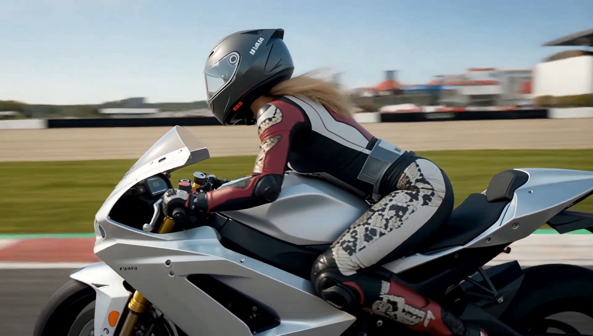 incredibly stunning breathtaking beautiful super-sexy dark-tanned lady badass supermodel, long blond wild one-sided hair, wearing a shiny super-tight snake-skin black and dark-red racing outfit with delicate cutouts and a futuristic helmet, racing on a hyper-futuristic shiny chrome racing-motorbike, driving at highspeed a narrow curve on a speedway, camera 180-fly-around, then following her, 16:9.