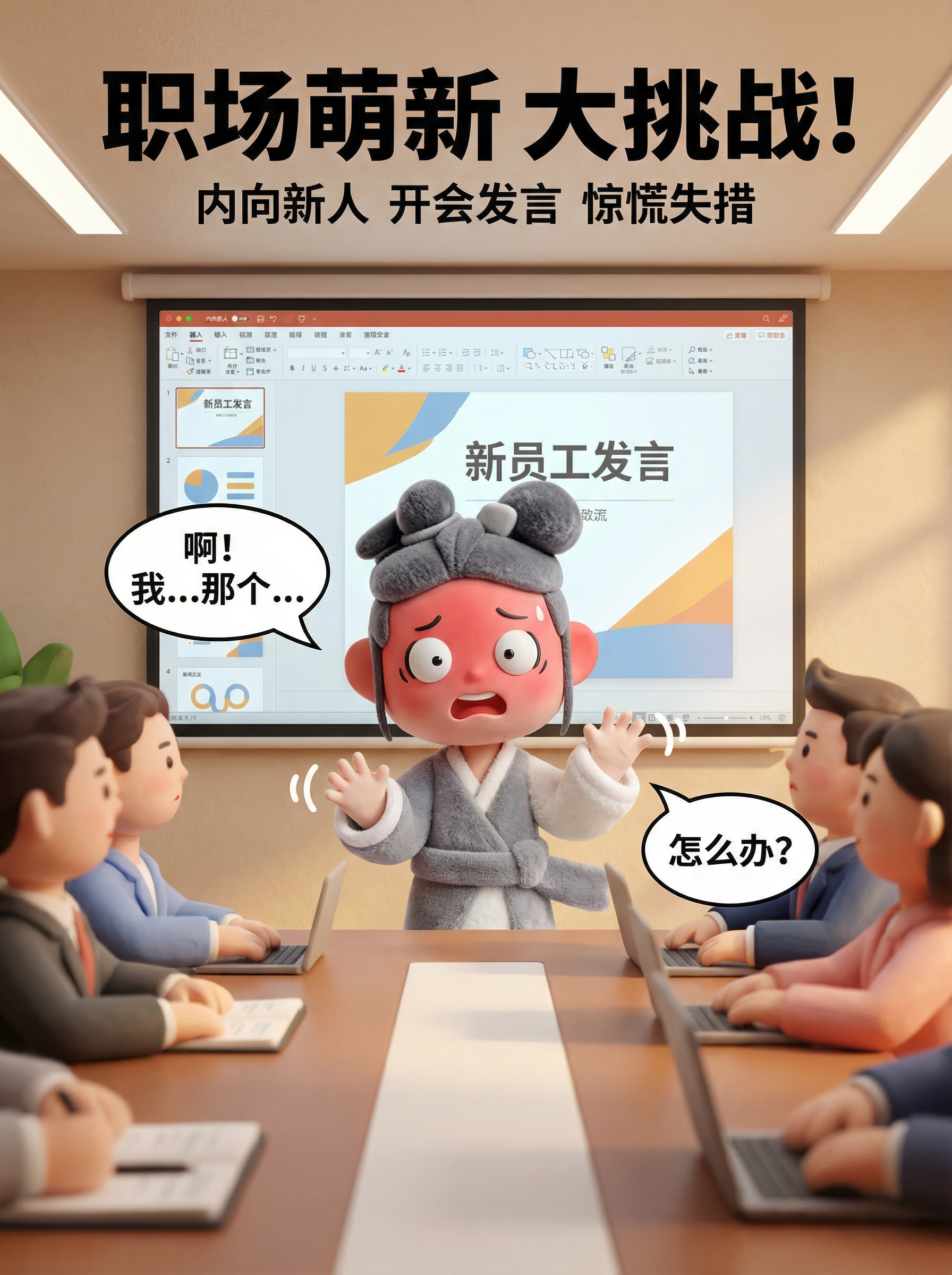 使用素材IP形象生成插画海报,背景为当代工作场景下刚入职职场的新人,性格内向脸皮薄,开会被点名发言惊慌手足无措