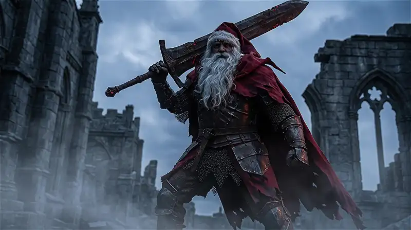 Dramatic camera slowly pans up to reveal a massive Santa Claus character styled as Slave Knight Gael from Dark Souls 3, wielding an ultra-greatsword in a dark, foreboding environment. The imposing figure stands silhouetted against dim light, with his tattered red cloak billowing in the cold wind. Atmospheric fog rolls across the ground as embers float through the air. The scene exudes power and dominance with stark, cold tones and a hint of festive red contrasting against the dreary backdrop. The emotional atmosphere is tense and foreboding, with ominous music building as the boss prepares for battle.