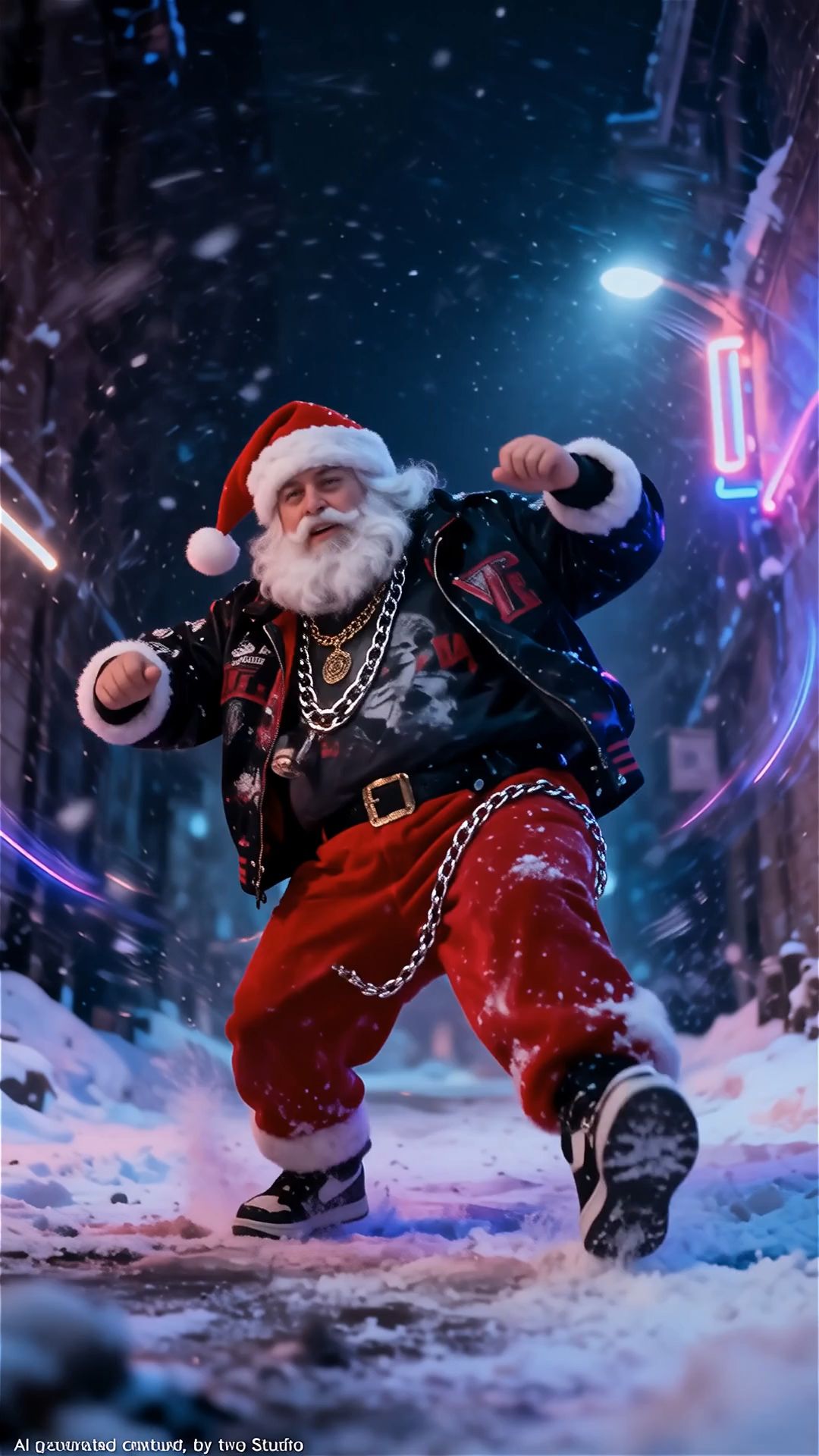 A cool fat Santa in hip-hop streetwear dances to a hip-hop rhythm and music in a snowy neon-lit alley. Fast-cut multi-camera movement: alternating low-angle and eye-level shots, quick lateral slides, brief handheld shake, and snap zooms on footwork and chains. Occasional whip pans and orbiting passes around Santa to emphasize energy and attitude. Cinematic lighting, shallow depth of field, high-contrast urban mood