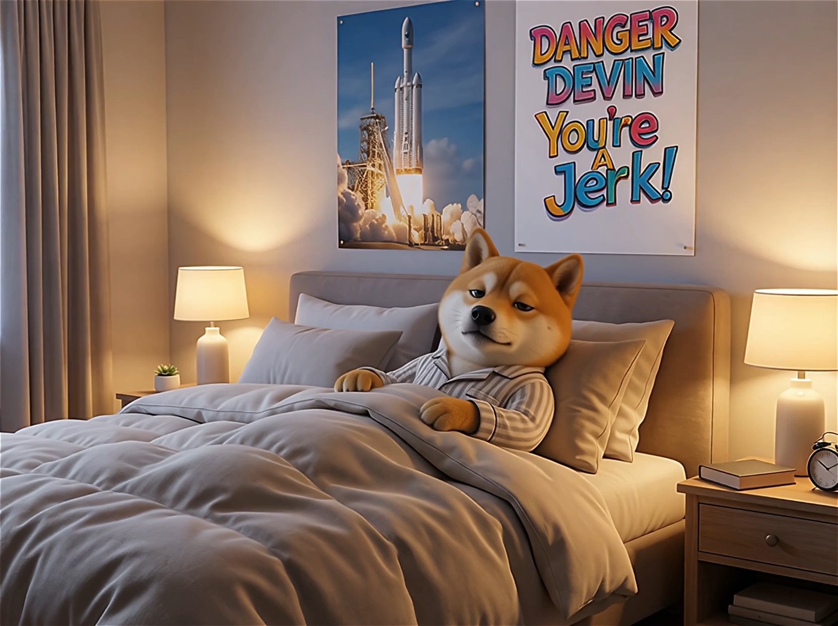 Shot 1: close-up on DOGE’s paw pressing a button on a DJ controller beside the bed. Music cuts instantly to silence with a clean stop, leaving only quiet room tone.