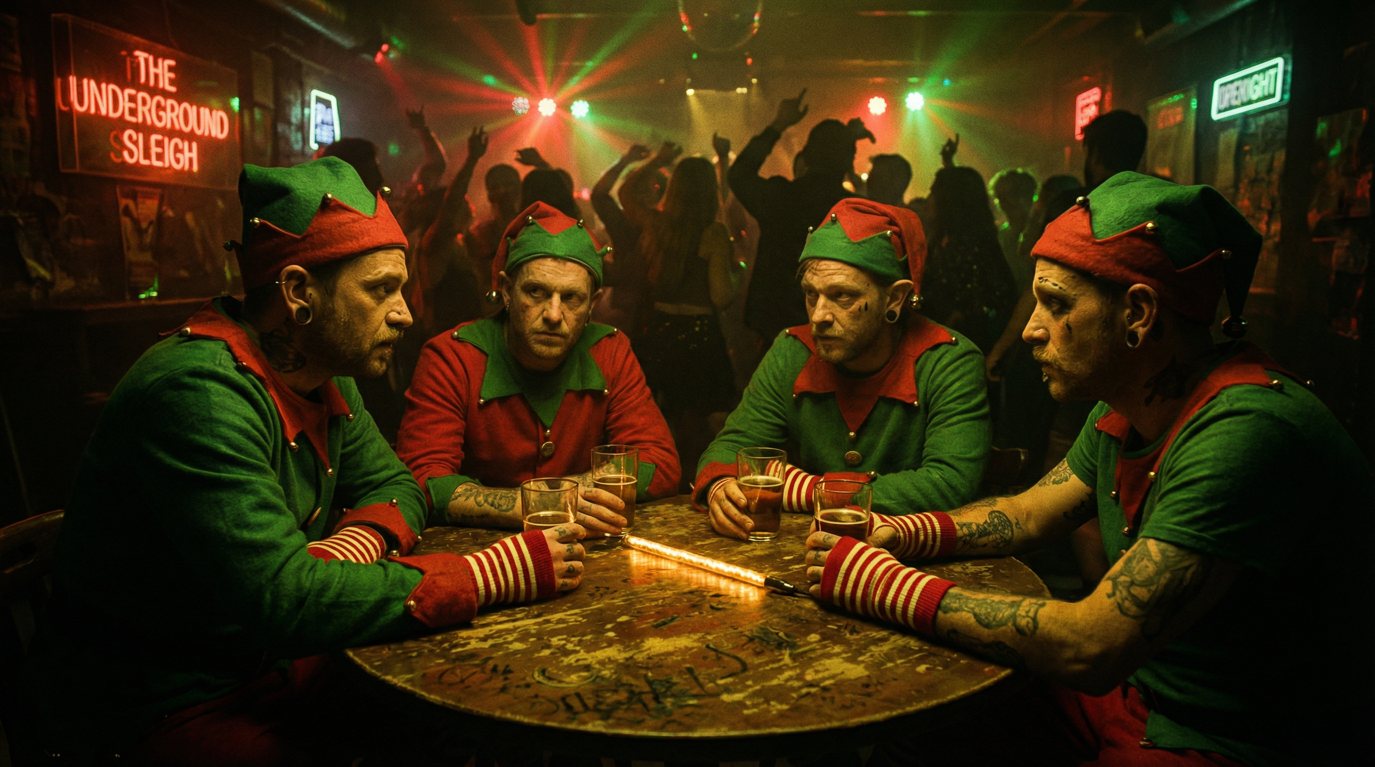 Gritty underground bar scene in the visual style of “The Prodigy – Smack My Bitch Up” music video: dark, chaotic, raw, handheld‑camera feel, harsh contrast, strong motion blur and noise. In the center of the frame, a round worn wooden table, seen from a slightly low and tilted angle. Around the table sit 4 Christmas elves in full festive elf costumes: green and red jackets, pointed hats with small bells, striped sleeves and details, pointy ears visible, some with tattoos and piercings, giving them a rough, underground vibe. Each elf is holding a heavy whiskey glass, amber liquid catching a thin strip of warm light on the table surface. Background: crowded, smoky underground bar, neon signs, dirty walls, graffiti, silhouettes of dancing people, stroboscopic club lights, deep shadows. Camera angle slightly tilted, close and intimate, like a first‑person POV from the video, aggressive framing, vignette on the edges. Color grading: dirty greens, deep reds, sickly yellows, desaturated skin tones, strong grain, dark and moody lighting, cinematic, 16:9