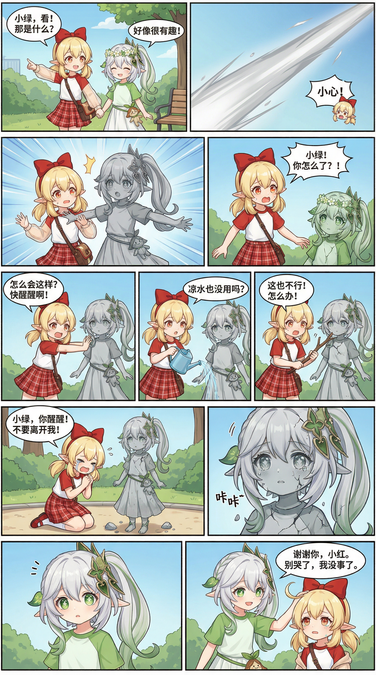 用参考图人物作为主角(参考图1主角名:小红,参考图2主角名:小绿),创作简体中文多格漫画,人物外形和参考图完全一致,分镜不少于8个。主要情节为小红和小绿外出游玩,小红发现石化光线。小绿为了保护小红挡住石化光线,导致小绿被全身石化,无法动弹,表情定格在惊讶。小红使用很多方法解除小绿的石化,但小绿还是无法动弹的石化雕像,保持之前惊讶看着小红的姿势。小红着急的哭了,导致石化小绿逐渐裂开。最终小绿恢复正常,小绿摸小红的头表示感谢.