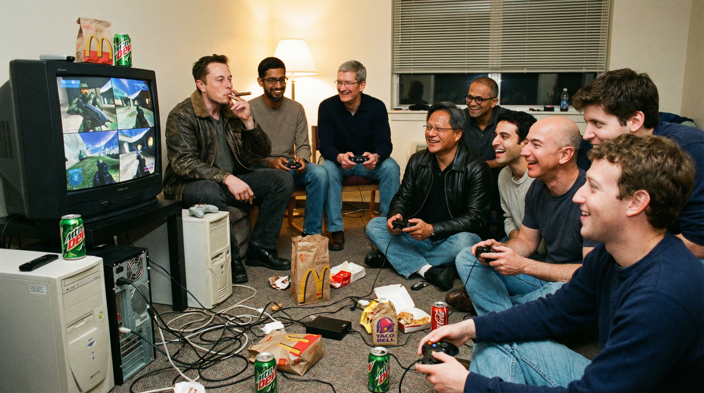 A nostalgic early 2000s college dorm room LAN party scene. Eight friends sitting on the floor and small chairs: 25-year-old Elon Musk in a leather jacket smoking a cigar, 25-year-old Sundar Pichai, 25-year-old Tim Cook, 25-year-old Jensen Huang in his signature leather jacket, 25-year-old Satya Nadella, 25-year-old Mark Zuckerberg, 25-year-old Jeff Bezos, and Sam Altman. All appearing as college students of that age. Playing split-screen console games together on an old CRT television. Room filled with fast food bags, soda cans, controllers and cables scattered around. Warm indoor lighting, relaxed and joyful atmosphere with everyone smiling and having fun. Retro console gaming setup with the TV displaying a Halo-style sci-fi shooter game. Natural candid group photo with slightly grainy 35mm film texture. Output images only, no text.