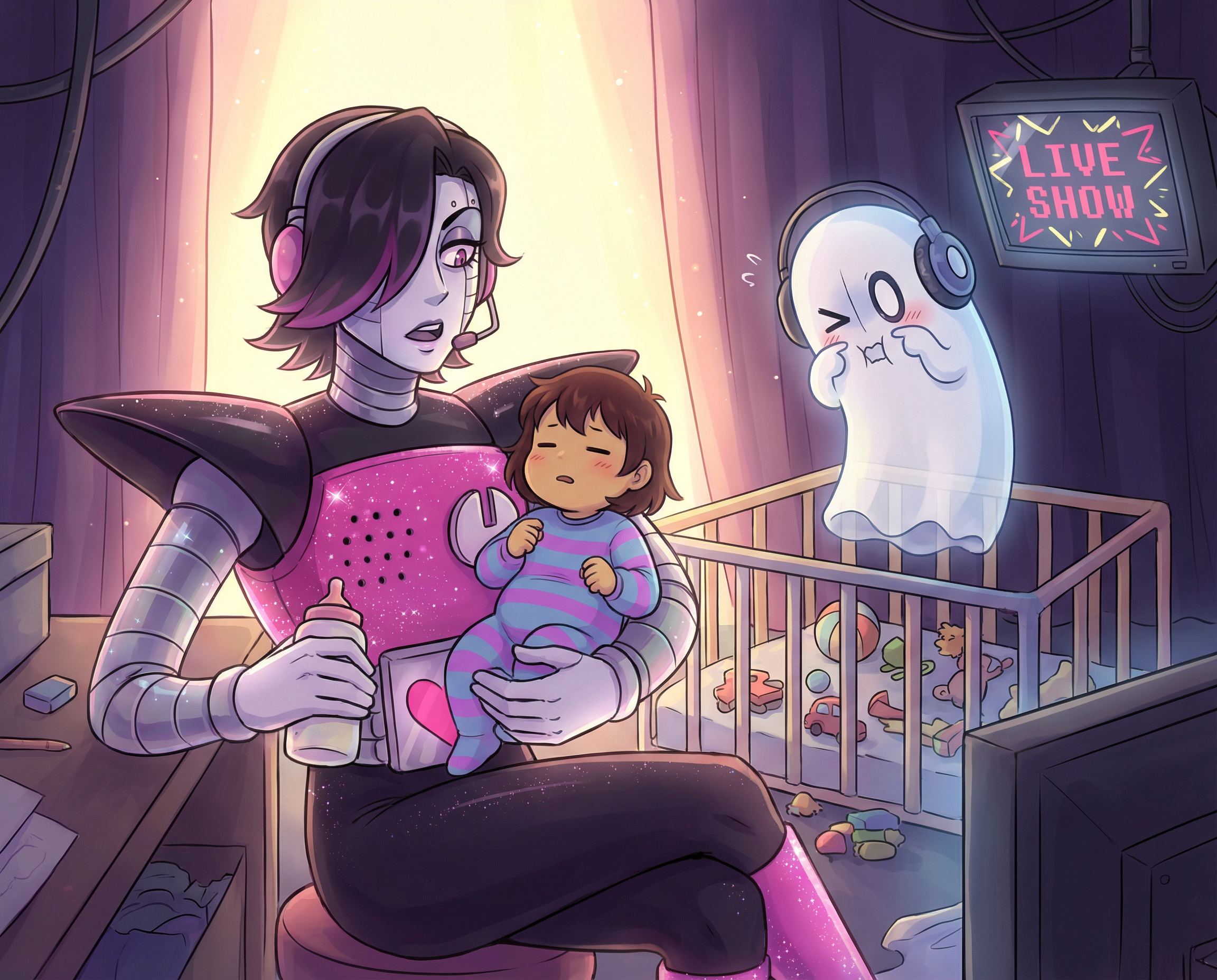 (Digital Anime Style) (Textless) Mettaton taking care of a baby Frisk... they just brought them with them to their live show, Napstablook is entertaining them backstage