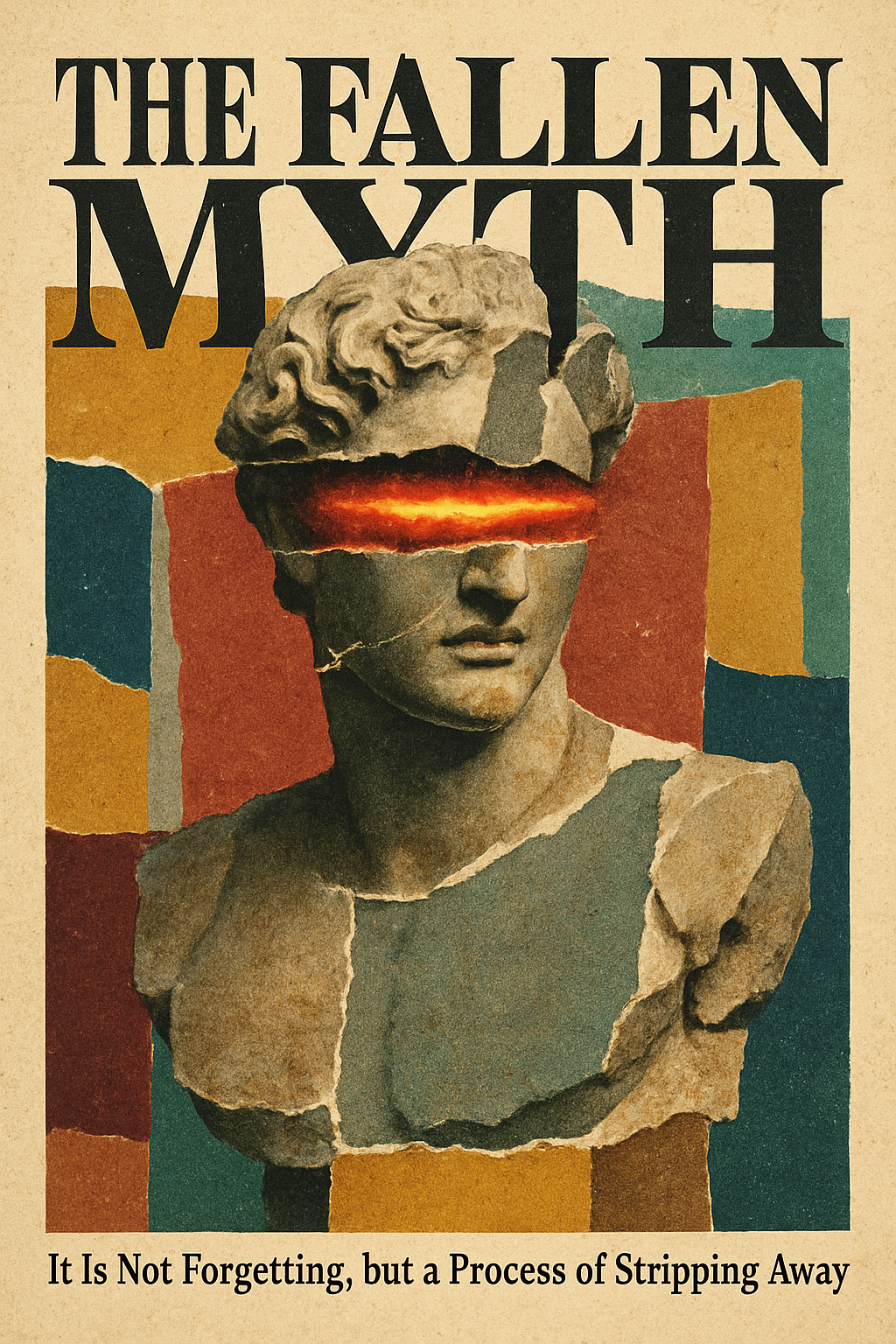 Surreal hand-cut collage poster with fragmented ancient Greek statue, torn paper, textured magazine clippings, gold and red glowing eye stripes, vintage retro color palette with muted greens, caramel browns, mustard yellows, burgundy reds, Prussian blues, bold serif typography with misaligned baselines, overlapping letters, grunge texture, print noise, title 'THE FALLEN MYTH', subtitle 'It Is Not Forgetting, but a Process of Stripping Away', advanced layout design 1