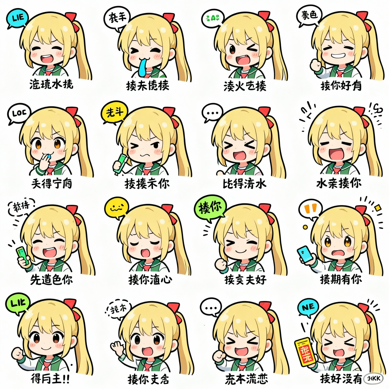 为我生成图中角色的绘制 Q 版的,LINE 风格的半身像表情包,注意头饰要正确 彩色手绘风格,使用 4x6 布局,涵盖各种各样的常用聊天用语如流口水,揍你等常用表情包, 其他需求:不要原图复制。所有标注为手写简体中文。 生成的图片需为 2K 分辨率 16:9