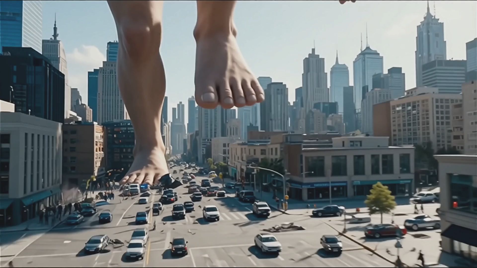 A gigantic woman wreaking havoc in a bustling metropolitan city.