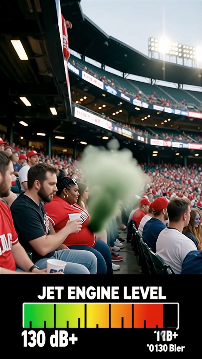 A visible air-pressure ripple explodes outward, warping the air vertically. Cups fly, hats lift, banners flutter violently. A decibel meter overlay spikes into red, labeled “JET ENGINE LEVEL.”