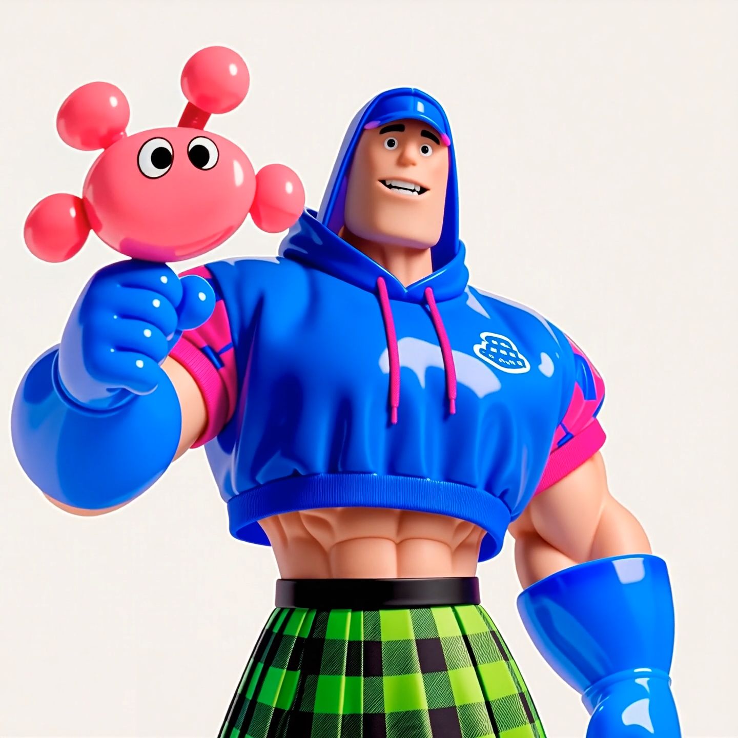 5-second smooth character showcase, one-take, continuous push-in. Low-angle dolly-in from shoes to torso with tilt-up, then subtle 15–20 degree arc orbit. High-gloss toycore 3D style, clean studio background, soft high-key lighting, flowing specular highlights. Character holds a pink mask; small controlled motion: slight chin lift and shoulder open, then gently raises the mask once and lets it swing slightly. Character opens mouth and speaks with a deep, masculine, excited tone: “Want a McDonald’s Happy Meal, sweetie?” Cool but stable camera, no shaky, no fast jitter, smooth animation, subtle cloth/strings secondary motion, accurate lip-sync.
